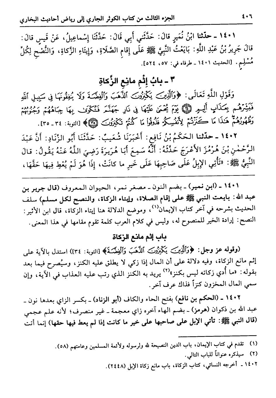 1401 - (ابن نمير) -بضم النون- مصغر نمر، الحيوان المعروف (قال جرير بن عبد الله: بايعت النبي - صلى الله عليه وسلم - على إقام الصلاة، وإيتاء الزكاة، والنصح لكل مسلم) سلف الحديث بشرحه في آخر كتاب الإيمان، وموضع الدلالة هنا إيتاء الزكاة، قال ابن الأثير: النصح: إرادة الخير للمنصوح له، وليس في كلام العرب كلمة تقوم مقامها في هذا المعنى.