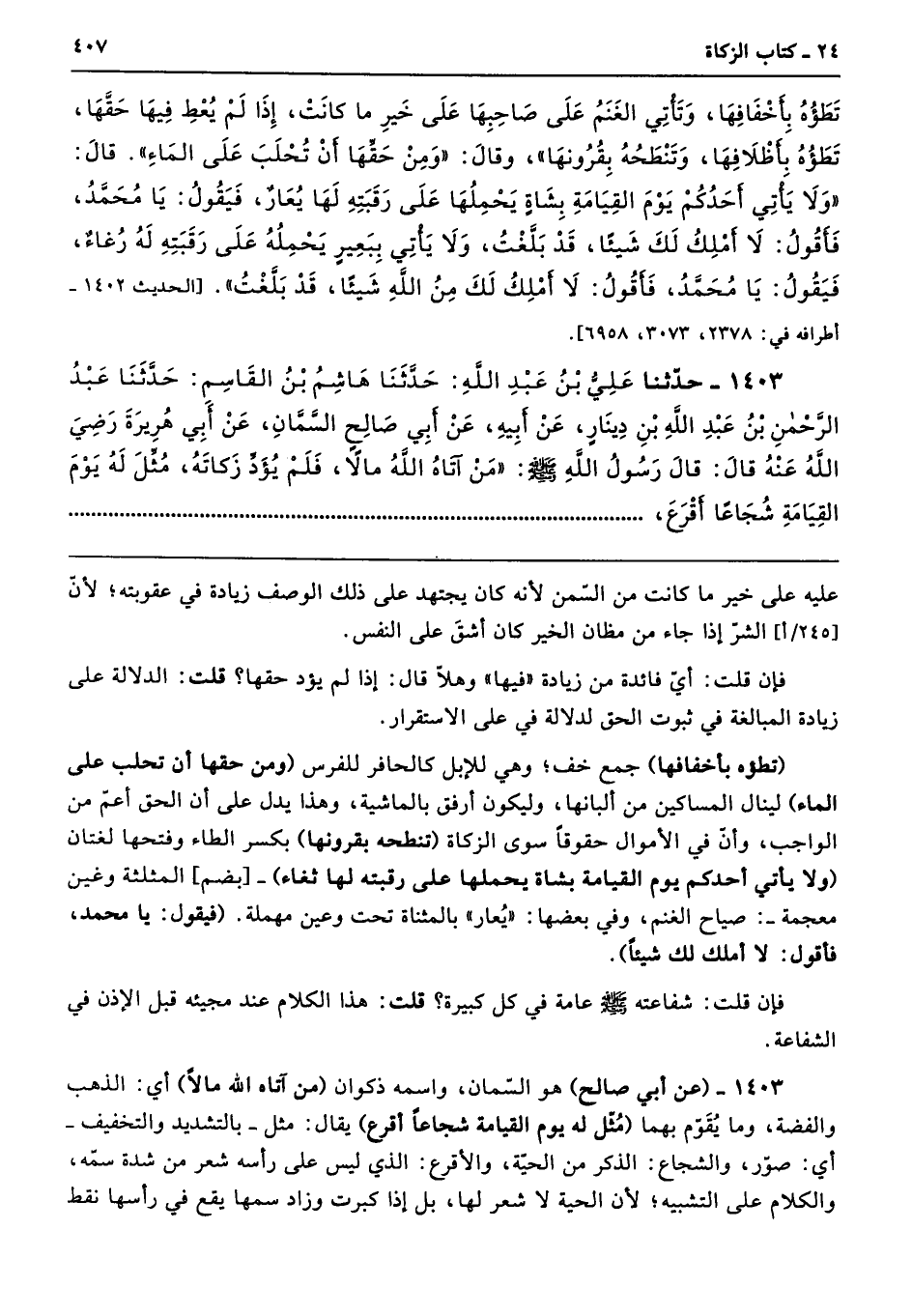 1403 - (عن أبي صالح) هو السّمان، واسمه ذكوان (من آتاه الله مالًا) أي: الذهب والفضة، وما يُقَوّم بهما (مُثّل له يوم القيامة شجاعًا أقرع) يقال: مثل -بالتشديد والتخفيف- أي: صوّر، والشجاع: الذكر من الحيّة، والأقرع: الذي ليس على رأسه شعر من شدة سمّه، والكلام على التشبيه؛ لأن الحية لا شعر لها، بل إذا كبرت وزاد سمها يقع في رأسها نقط