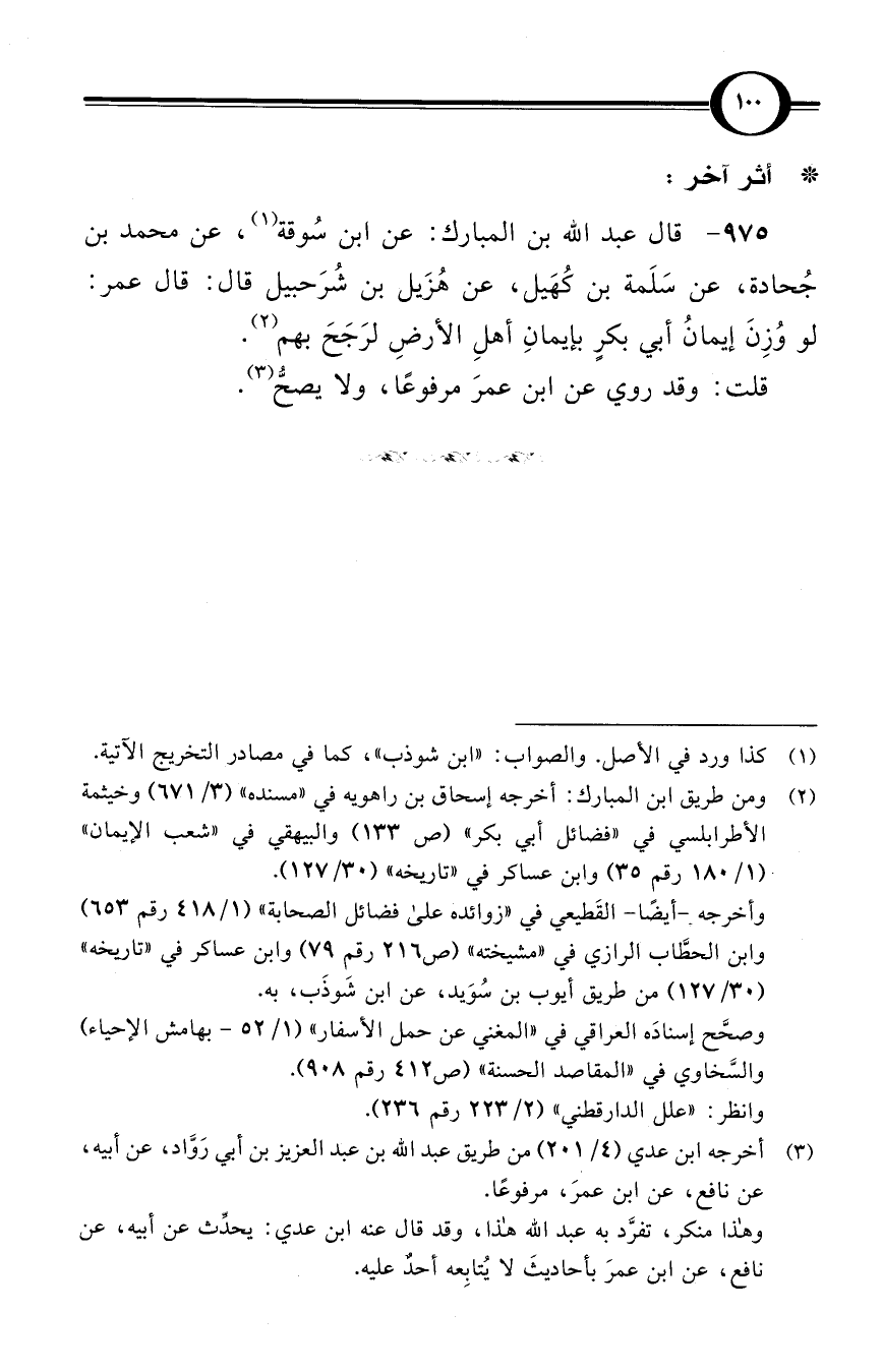 (975) قال عبد الله بن المبارك: عن ابن سُوقة (¬1)، عن محمد بن جُحادة، عن سَلَمة بن كُهَيل، عن هُزَيل بن شُرَحبيل قال: قال عمر: لو وُزِنَ إيمانُ أبي بكرٍ بإيمانِ أهلِ الأرضِ لرَجَحَ بهم (¬2).