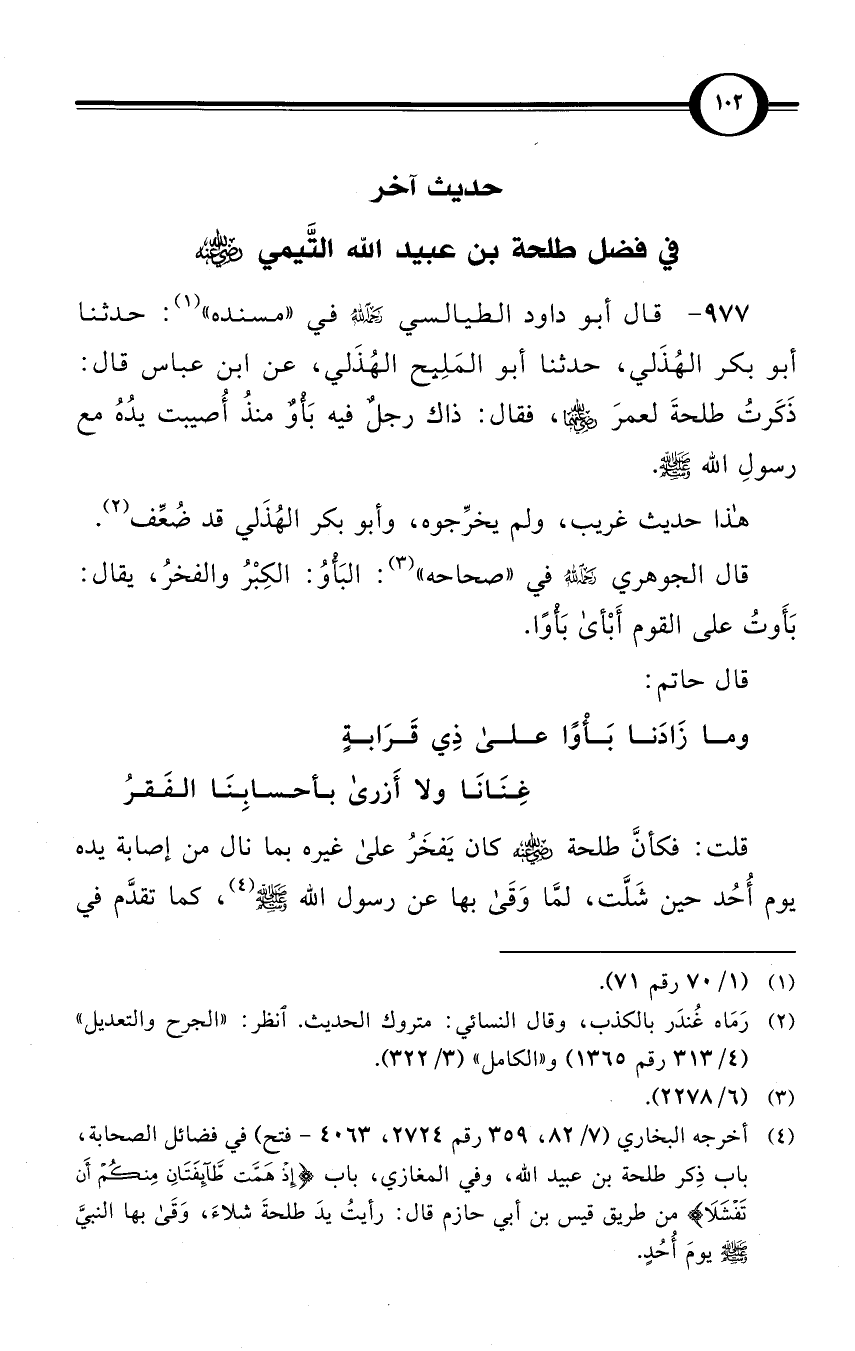 (977) قال أبو داود الطيالسي -رحمه الله- في «مسنده» (¬1): حدثنا أبو بكر الهُذَلي، حدثنا أبو المَلِيح الهُذَلي، عن ابن عباس قال: ذَكَرتُ طلحةَ لعمرَ -رضي الله عنهما-، فقال: ذاك رجلٌ فيه بَأْوٌ منذُ أُصيبت يدُهُ مع رسولِ الله صلى الله عليه وسلم.