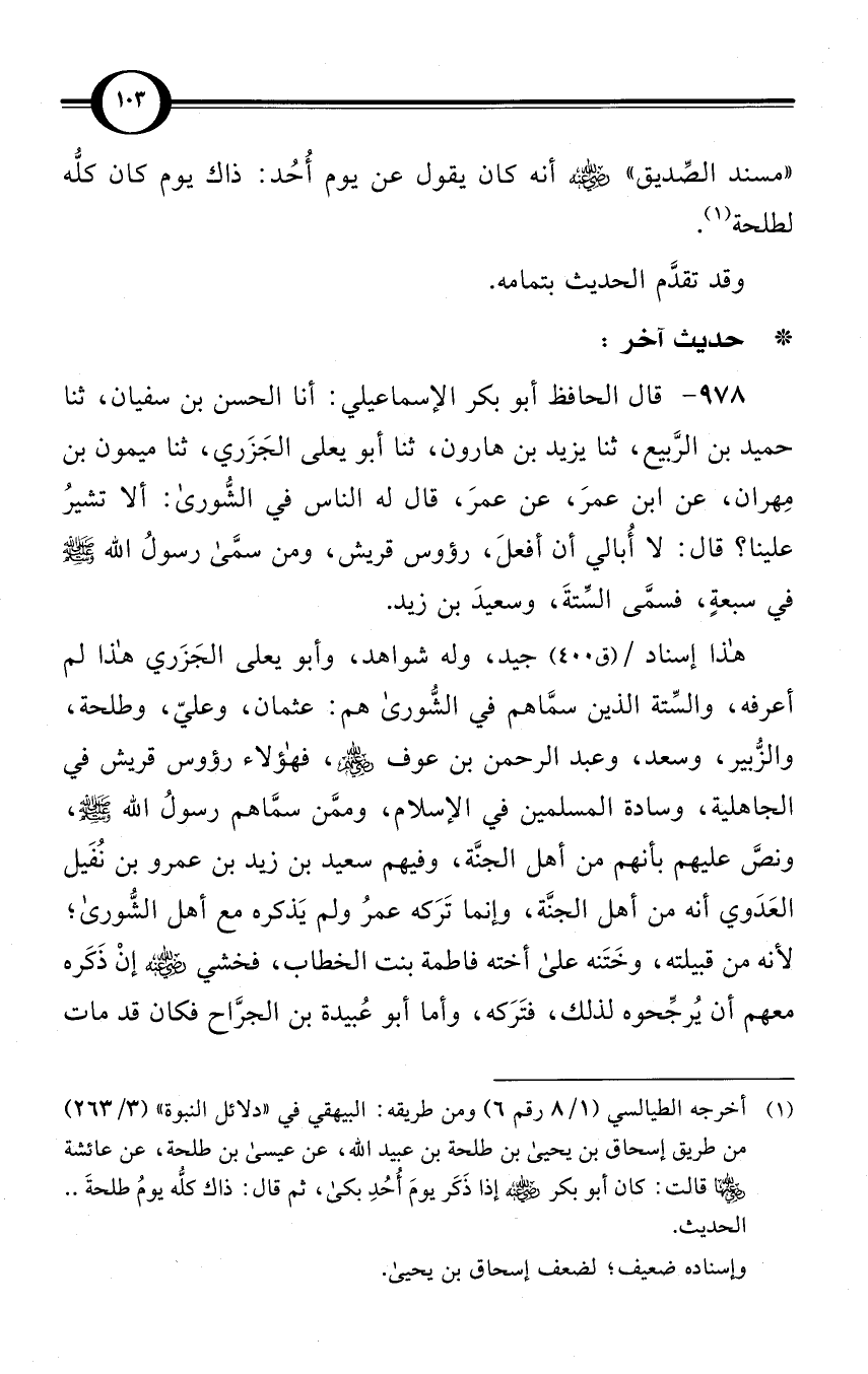 (978) قال الحافظ أبو بكر الإسماعيلي: أنا الحسن بن سفيان، ثنا حميد بن الرَّبيع، ثنا يزيد بن هارون، ثنا أبو يعلى الجَزَري، ثنا ميمون بن مِهران، عن ابن عمرَ، عن عمرَ، قال له الناس في الشُّورى: ألا تشيرُ علينا؟ قال: لا أُبالي أن أفعلَ، رؤوس قريش، ومن سمَّى رسولُ الله صلى الله عليه وسلم في سبعةٍ، فسمَّى السِّتةَ، وسعيدَ بن زيد.
