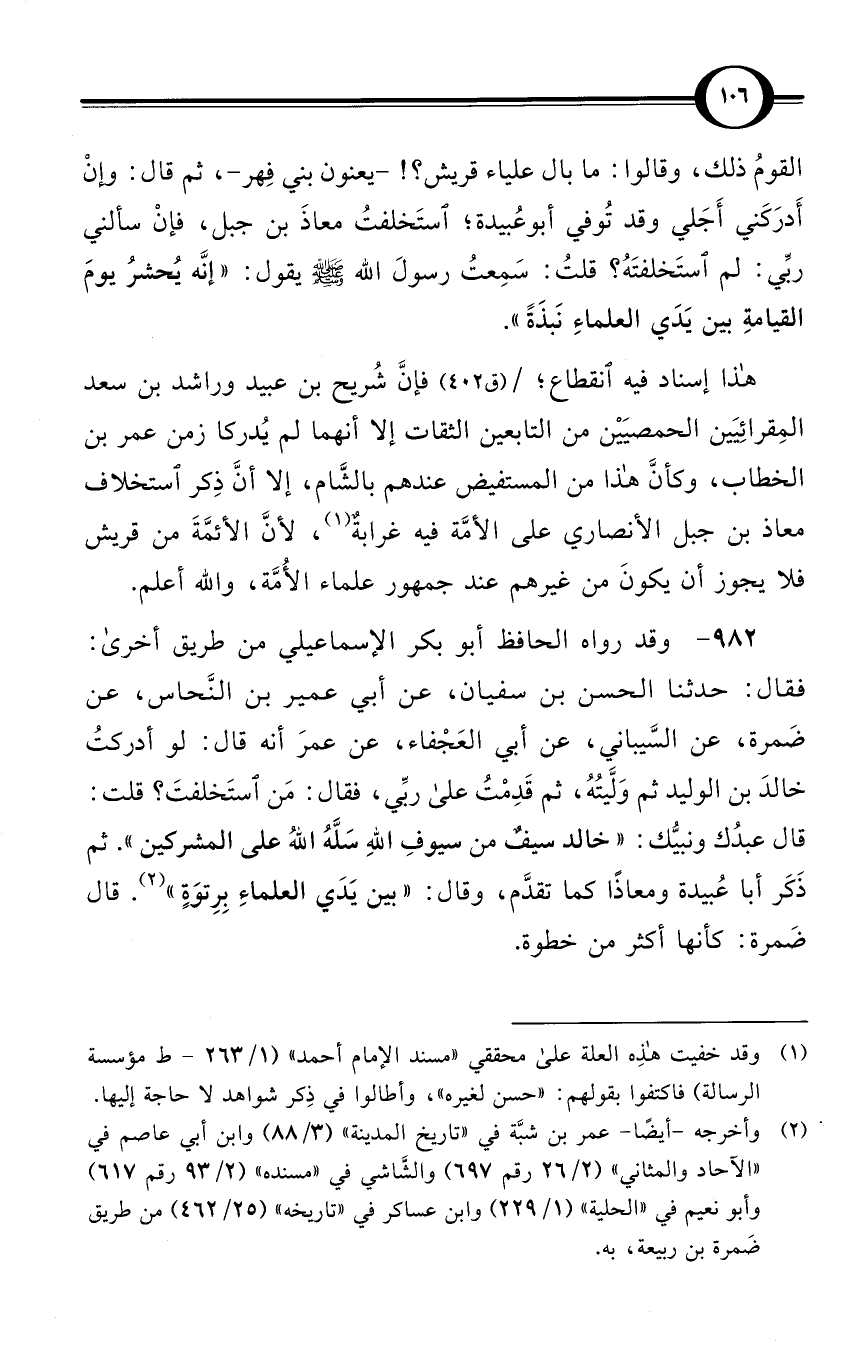 (982) وقد رواه الحافظ أبو بكر الإسماعيلي من طريق أخرى: فقال: حدثنا الحسن بن سفيان، عن أبي عمير بن النَّحاس، عن ضَمرة، عن السَّيباني، عن أبي العَجْفاء، عن عمرَ أنه قال: لو أدركتُ خالدَ بن الوليد ثم وَلَّيتُهُ، ثم قَدِمْتُ على ربِّي، فقال: مَن استَخلفتَ؟ قلت: قال عبدُك ونبيُّك: «خالد سيفٌ من سيوفِ اللهِ سَلَّهُ اللهُ على المشركين». ثم ذَكَر أبا عُبيدة ومعاذًا كما تقدَّم، وقال: «بين يَدَي العلماءِ بِرِتوَةٍ» (¬2). قال ضَمرة: كأنها أكثر من خطوة.
