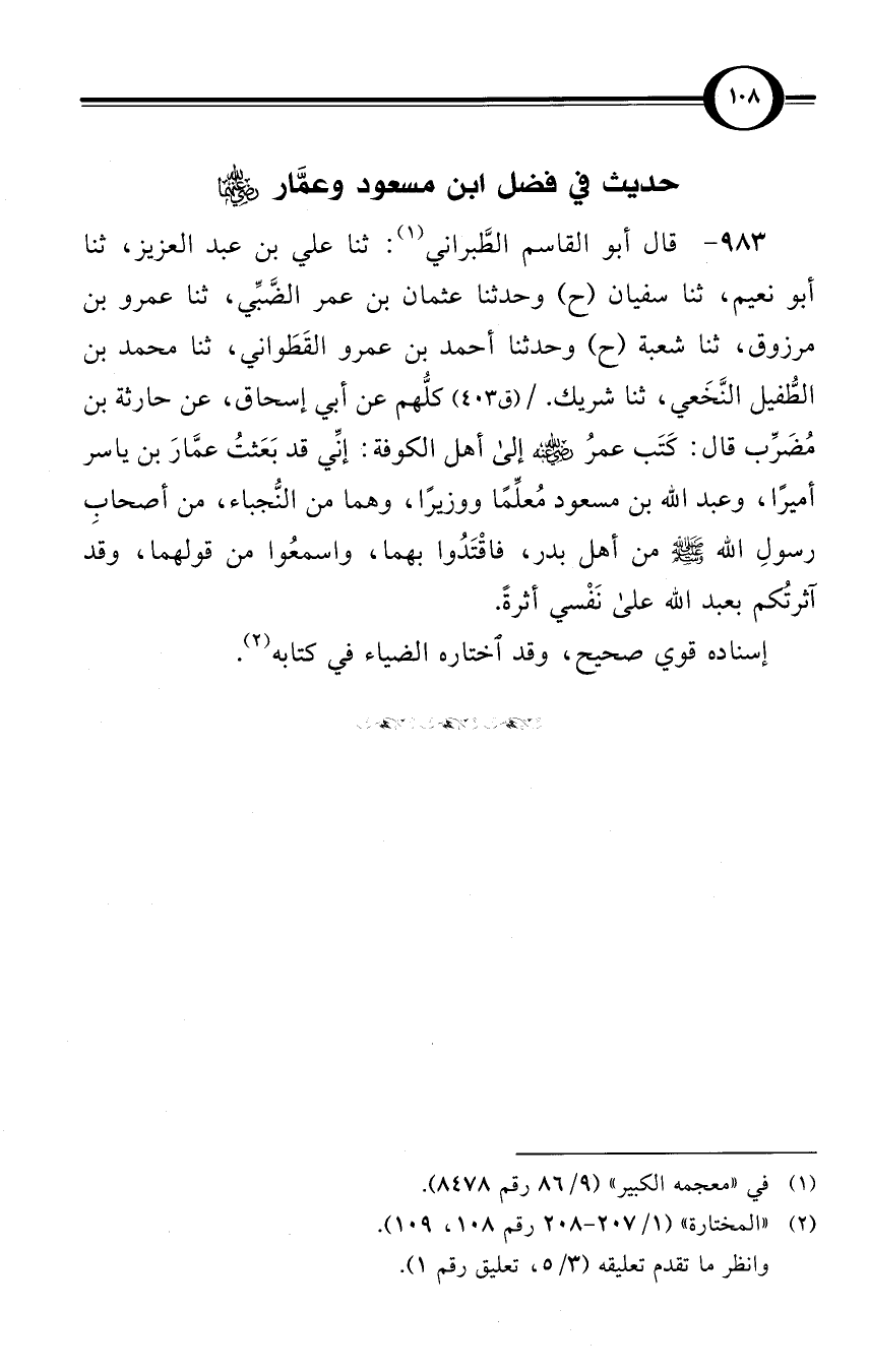 (983) قال أبو القاسم الطَّبراني (¬1): ثنا علي بن عبد العزيز، ثنا أبو نعيم، ثنا سفيان (ح) وحدثنا عثمان بن عمر الضَّبِّي، ثنا عمرو بن مرزوق، ثنا شعبة (ح) وحدثنا أحمد بن عمرو القَطَواني، ثنا محمد بن الطُّفيل النَّخَعي، ثنا شريك. / (ق 403) كلُّهم عن أبي إسحاق، عن حارثة بن مُضَرِّب قال: كَتَب عمرُ -رضي الله عنه- إلى أهل الكوفة: إنِّي قد بَعَثتُ عمَّارَ بن ياسر أميرًا، وعبد الله بن مسعود مُعلِّمًا ووزيرًا، وهما من النُّجباء، من أصحابِ رسولِ الله صلى الله عليه وسلم من أهل بدر، فاقْتَدُوا بهما، واسمعُوا من قولهما، وقد آثرتُكم بعبد الله على نَفْسي أثرةً.