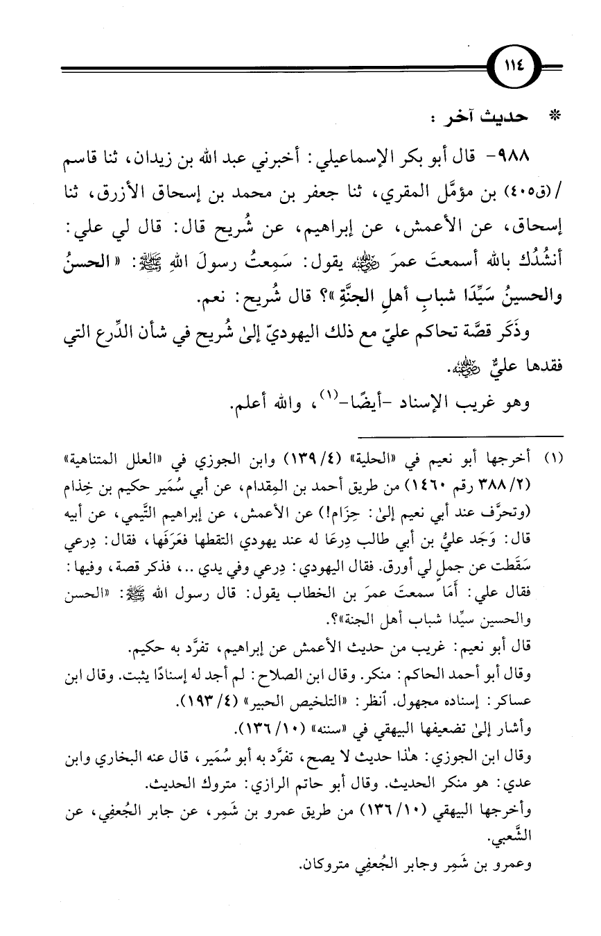 (988) قال أبو بكر الإسماعيلي: أخبرني عبد الله بن زيدان، ثنا قاسم / (ق 405) بن مؤمَّل المقري، ثنا جعفر بن محمد بن إسحاق الأزرق، ثنا إسحاق، عن الأعمش، عن إبراهيم، عن شُريح قال: قال لي علي: أنشُدُك بالله أسمعتَ عمرَ -رضي الله عنه- يقول: سَمِعتُ رسولَ اللهِ صلى الله عليه وسلم: «الحسنُ والحسينُ سَيِّدَا شبابِ أهلِ الجنَّةِ»؟ قال شُريح: نعم.