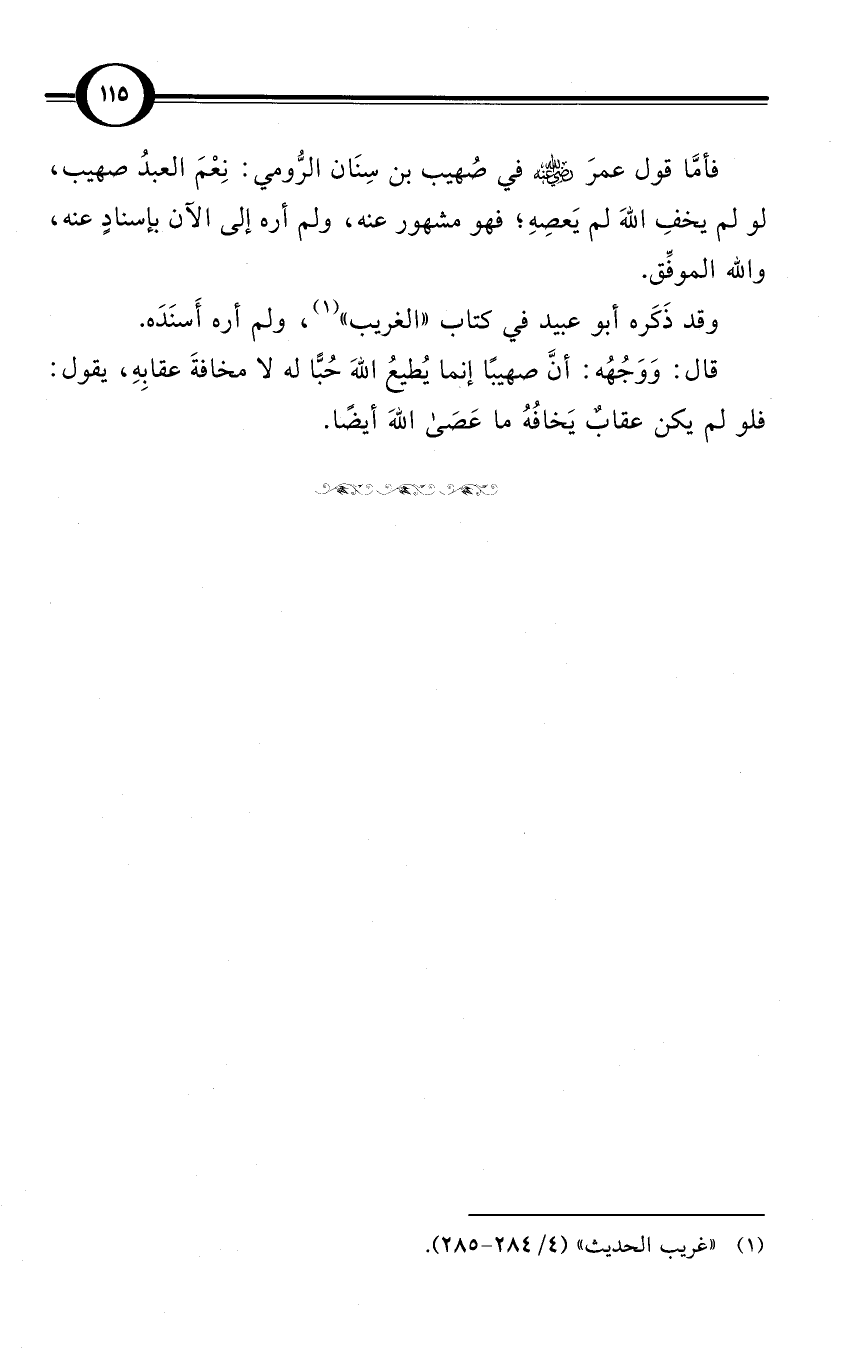 فأمَّا قول عمرَ -رضي الله عنه- في صُهيب بن سِنَان الرُّومي: نِعْمَ العبدُ صهيب، لو لم يخفِ اللهَ لم يَعصِهِ؛ فهو مشهور عنه، ولم أره إلى الآن بإسنادٍ عنه، والله الموفِّق.