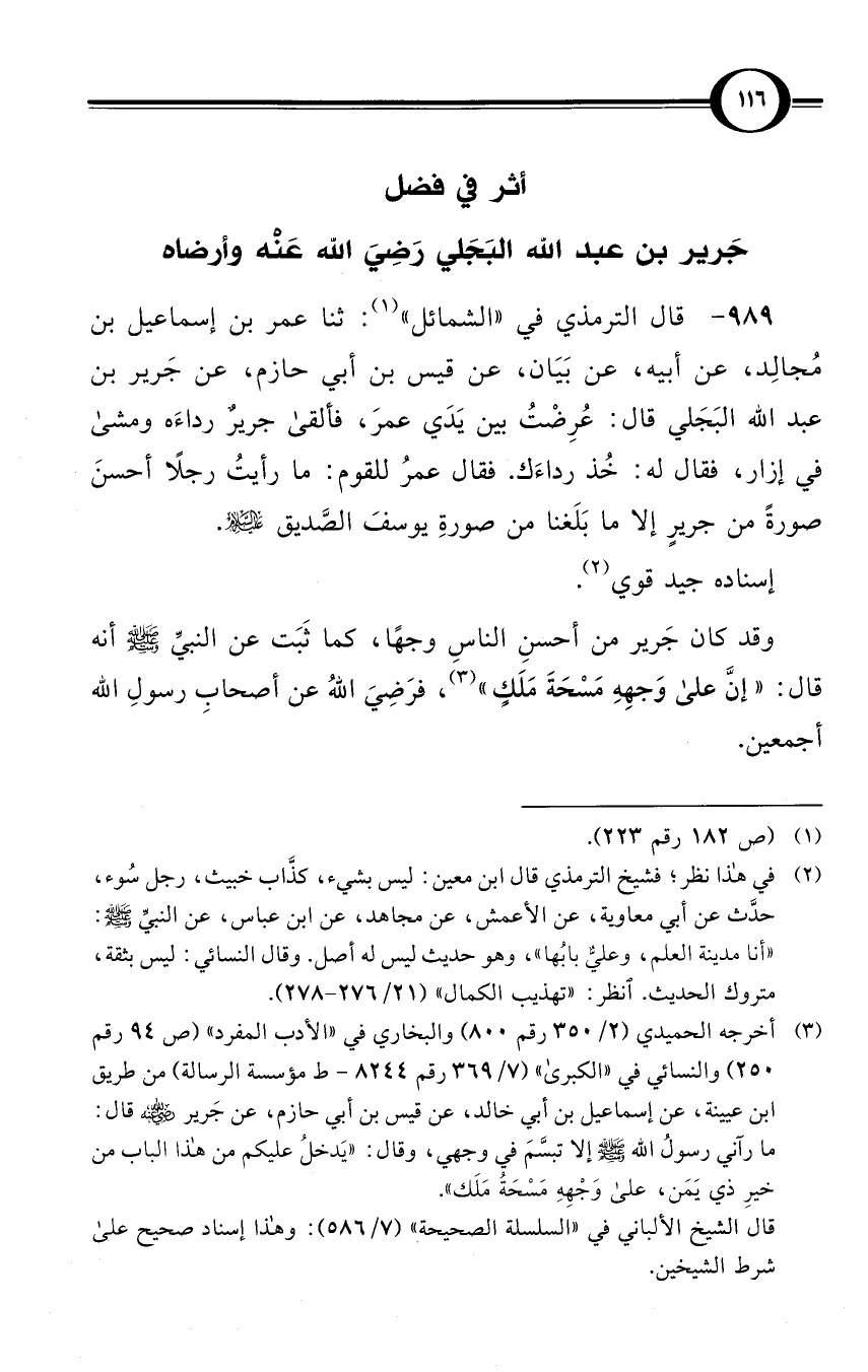 (989) قال الترمذي في «الشمائل» (¬1): ثنا عمر بن إسماعيل بن مُجالِد، عن أبيه، عن بَيَان، عن قيس بن أبي حازم، عن جَرير بن عبد الله البَجَلي قال: عُرِضْتُ بين يَدَي عمرَ، فألقى جريرٌ رداءَه ومشى في إزار، فقال له: خُذ رداءَك. فقال عمرُ للقوم: ما رأيتُ رجلاً أحسنَ صورةً من جريرٍ إلا ما بَلَغنا من صورةِ يوسفَ الصَّديق عليه السلام.