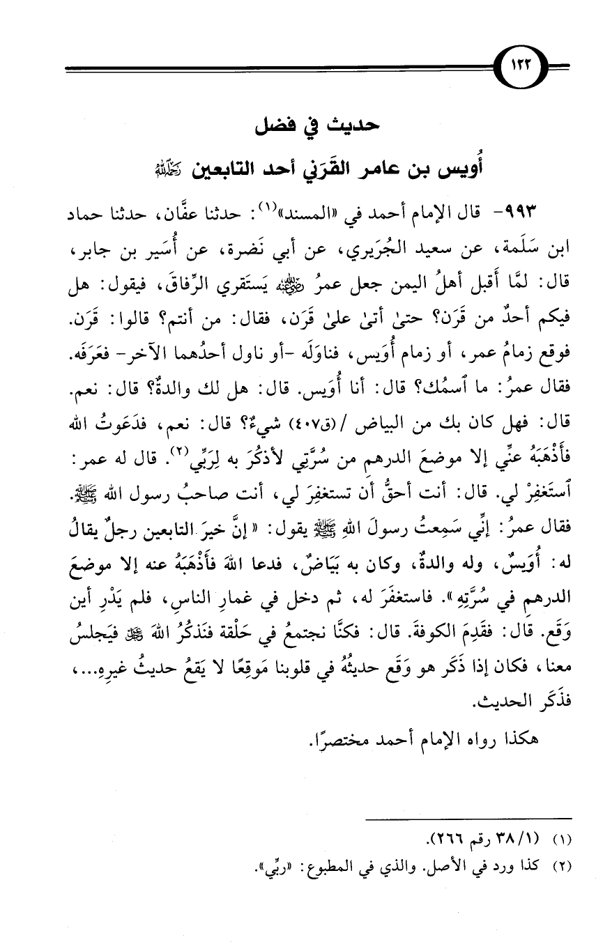 (993) قال الإمام أحمد في «المسند» (¬1): حدثنا عفَّان، حدثنا حماد بن سَلَمة، عن سعيد الجُرَيري، عن أبي نَضرة، عن أُسَير بن جابر، قال: لمَّا أَقبل أهلُ اليمن جعل عمرُ -رضي الله عنه- يَستَقري الرِّفاقَ، فيقول: هل فيكم أحدٌ من قَرَن؟ حتى أتى على قَرَن، فقال: من أنتم؟ قالوا: قَرَن. فوقع زمامُ عمر، أو زمام أُوَيس، فناوَلَه -أو ناول أحدُهما الآخر- فعَرَفَه. فقال عمرُ: ما اسمُك؟ قال: أنا أُوَيس. قال: هل لك والدةٌ؟ قال: نعم. قال: فهل كان بك من البياض / (ق 407) شيءٌ؟ قال: نعم، فدَعَوتُ الله فأَذْهَبَهُ عنِّي إلا موضعَ الدرهمِ من سُرَّتِي لأذكُرَ به لِرَبِّي (¬2). قال له عمر: استَغفِرْ لي. قال: أنت أحقُّ أن تستغفِرَ لي، أنت صاحبُ رسول الله صلى الله عليه وسلم. فقال عمرُ: إنِّي سَمِعتُ رسولَ اللهِ صلى الله عليه وسلم يقول: «إنَّ خيرَ التابعين رجلٌ يقالُ له: أُوَيسٌ، وله والدةٌ، وكان به بَيَاضٌ، فدعا اللهَ فأَذْهَبَهُ عنه إلا موضعَ الدرهمِ في سُرَّتِهِ». فاستغفَرَ له، ثم دخل في غمارِ الناسِ، فلم يَدْرِ أين وَقَع. قال: فقَدِمَ الكوفةَ. قال: فكنَّا نجتمعُ في حَلْقة فنَذكُرُ اللهَ عزَّ وجلَّ فيَجلسُ معنا، فكان إذا ذَكَر هو وَقَع حديثُهُ في قلوبنا مَوقِعًا لا يَقعُ حديثُ غيرِهِ ... ، فذَكَر الحديث.