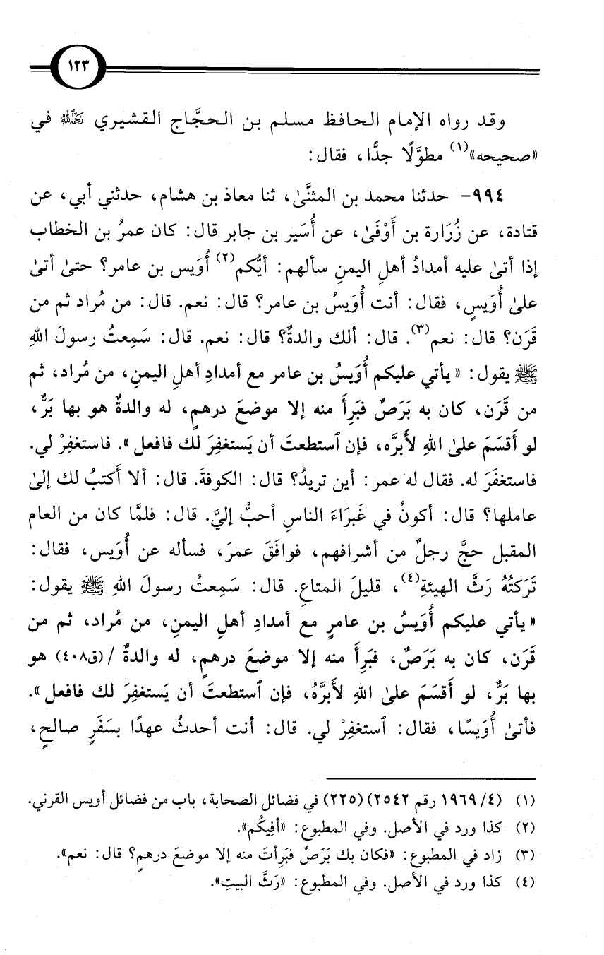 (994) حدثنا محمد بن المثنَّى، ثنا معاذ بن هشام، حدثني أبي، عن قتادة، عن زُرَارة بن أَوْفَى، عن أُسَير بن جابر قال: كان عمرُ بن الخطاب إذا أتى عليه أمدادُ أهلِ اليمنِ سألهم: أيُّكم (¬2) أُوَيس بن عامر؟ حتى أتى على أُوَيسٍ، فقال: أنت أُوَيسُ بن عامر؟ قال: نعم. قال: من مُراد ثم من قَرَن؟ قال: نعم (¬3). قال: ألك والدةٌ؟ قال: نعم. قال: سَمِعتُ رسولَ اللهِ صلى الله عليه وسلم يقول: «يأتي عليكم أُوَيسُ بن عامر مع أمدادِ أهلِ اليمنِ، من مُراد، ثم من قَرَن، كان به بَرَصٌ فبَرِأَ منه إلا موضعَ درهمٍ، له والدةٌ هو بها بَرٌّ، لو أَقسَمَ على اللهِ لأَبرَّه، فإن استطعتَ أن يَستغفِرَ لك فافعل». فاستغفِرْ لي. فاستغفَرَ له. فقال له عمر: أين تريدُ؟ قال: الكوفةَ. قال: ألا أَكتبُ لك إلى عاملها؟ قال: أكونُ في غَبرَاءَ الناسِ أحبُّ إليَّ. قال: فلمَّا كان من العام المقبل حجَّ رجلٌ من أشرافهم، فوافَقَ عمرَ، فسأله عن أُوَيس، فقال: تَرَكتُهُ رَثَّ الهيئةِ (¬4)، قليلَ المتاعِ. قال: سَمِعتُ رسولَ اللهِ صلى الله عليه وسلم يقول: «يأتي عليكم أُوَيسُ بن عامرٍ مع أمدادِ أهلِ اليمنِ، من مُراد، ثم من قَرَن، كان به بَرَصٌ، فبَرِأَ منه إلا موضعَ درهمٍ، له والدةٌ / (ق 408) هو بها بَرٌّ، لو أَقسَمَ على اللهِ لأَبرَّهُ، فإن استطعتَ أن يَستغفِرَ لك فافعل». فأتى أُوَيسًا، فقال: استغفِرْ لي. قال: أنت أحدثُ عهدًا بسَفَرٍ صالحٍ،