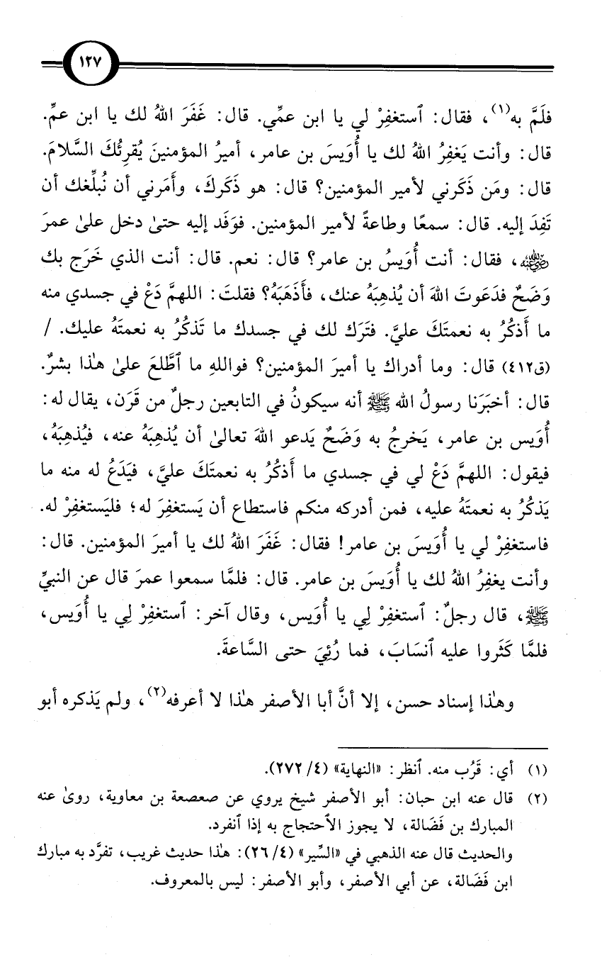 فلَمَّ به (¬1)، فقال: استغفِرْ لي يا ابنَ عمِّي. قال: غَفَرَ اللهُ لك يا ابنَ عمِّ. قال: وأنت يَغفِرُ اللهُ لك يا أُوَيسَ بن عامر، أميرُ المؤمنينَ يُقرِئُكَ السَّلامَ.
