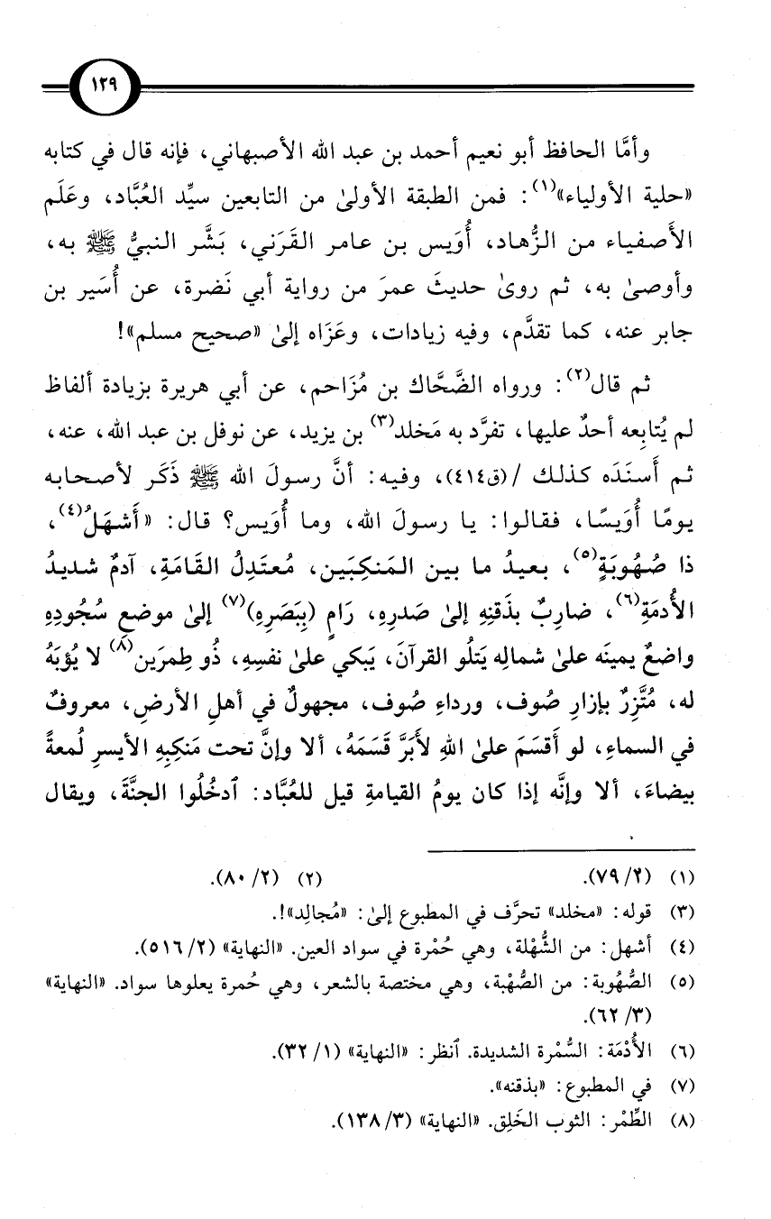 وأمَّا الحافظ أبو نعيم أحمد بن عبد الله الأصبهاني، فإنه قال في كتابه «حلية الأولياء» (¬1): فمن الطبقة الأولى من التابعين سيِّد العُبَّاد، وعَلَم الأَصفياء من الزُّهاد، أُوَيس بن عامر القَرَني، بَشَّر النبيُّ صلى الله عليه وسلم به، وأوصى به، ثم روى حديثَ عمرَ من رواية أبي نَضرة، عن أُسَير بن جابر عنه، كما تقدَّم، وفيه زيادات، وعَزَاه إلى «صحيح مسلم»!