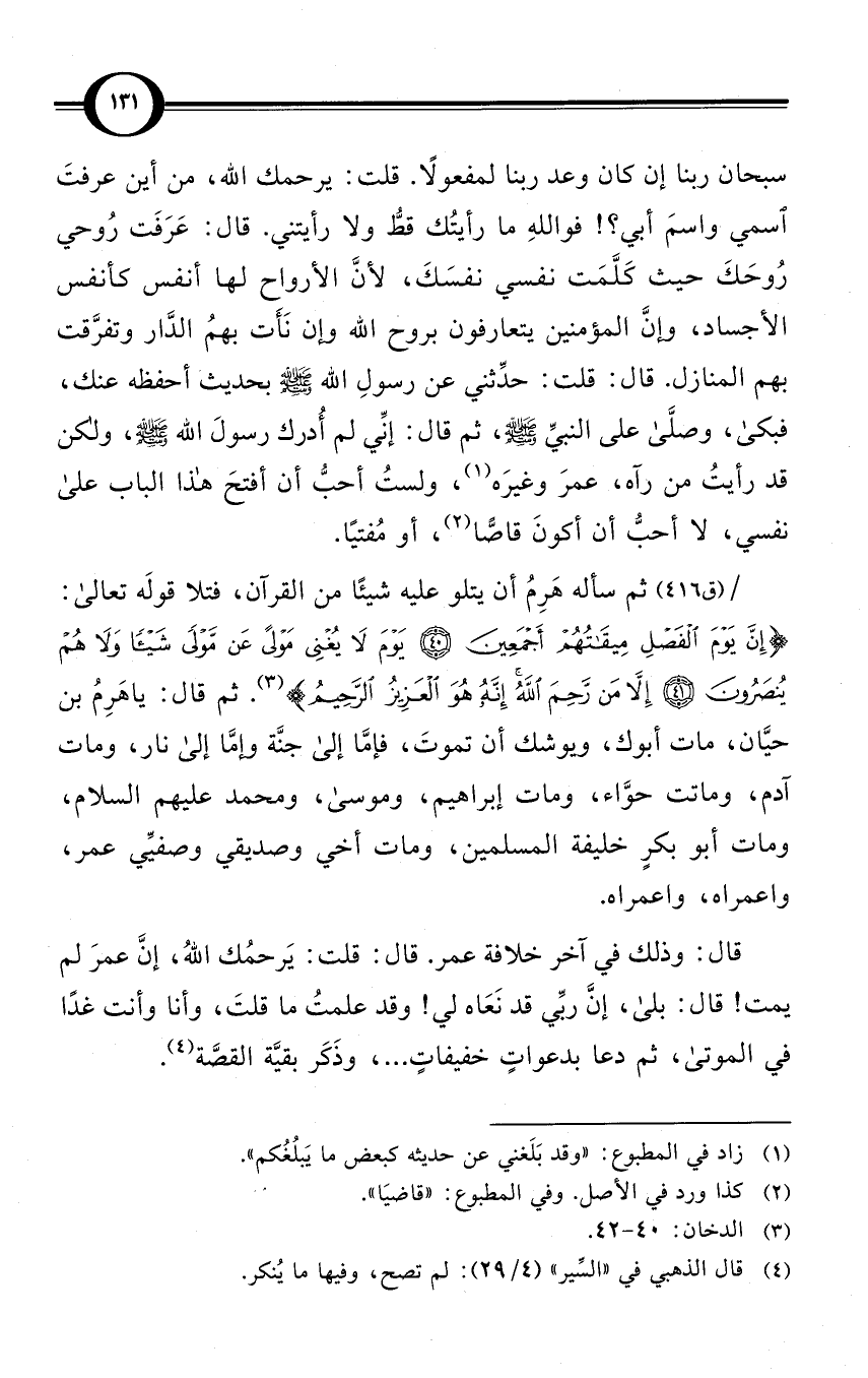 / (ق 416) ثم سأله هَرِمُ أن يتلو عليه شيئًا من القرآن، فتلا قولَه تعالى: {إن يوم الفصل ميقاتهم أجمعين. يوم لا يغني مولى عن مولى شيئاً ولا هم ينصرون. إلا من رحم الله إنه هو العزيز الرحيم} (¬3). ثم قال: ياهَرِمُ بن حيَّان، مات أبوك، ويوشك أن تموتَ، فإمَّا إلى جنَّة وإمَّا إلى نار، ومات آدم، وماتت حوَّاء، ومات إبراهيم، وموسى، ومحمد عليهم السلام، ومات أبو بكرٍ خليفة المسلمين، ومات أخي وصديقي وصفيِّي عمر، واعمراه، واعمراه.