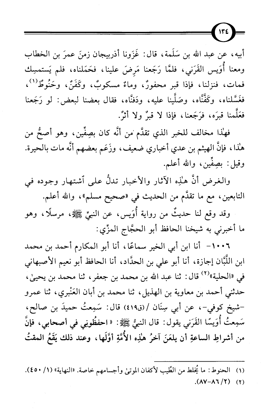 (1006) أنا ابن أبي الخير سماعًا، أنا أبو المكارم أحمد بن محمد بن اللَّبَّان إجازة، أنا أبو علي بن الحدَّاد، أنا الحافظ أبو نعيم الأصبهاني في «الحلية» (¬2) قال: ثنا عبد الله بن محمد بن جعفر، ثنا محمد بن يحيى، حدثني أحمد بن معاوية بن الهذيل، ثنا محمد بن أبان العَنْبري، ثنا عمرو -شيخ كوفي-، عن أبي سِنَان / (ق 419) قال: سَمِعتُ حميدَ بن صالح، سَمِعتُ أُوَيسًا القَرَني يقول: قال النبيُّ صلى الله عليه وسلم: «احفظُونِي في أصحابي، فإنَّ من أشراطِ الساعةِ أن يلعَنَ آخرُ هذه الأُمَّةِ أوَّلَها، وعند ذلك يَقَعُ المقتُ