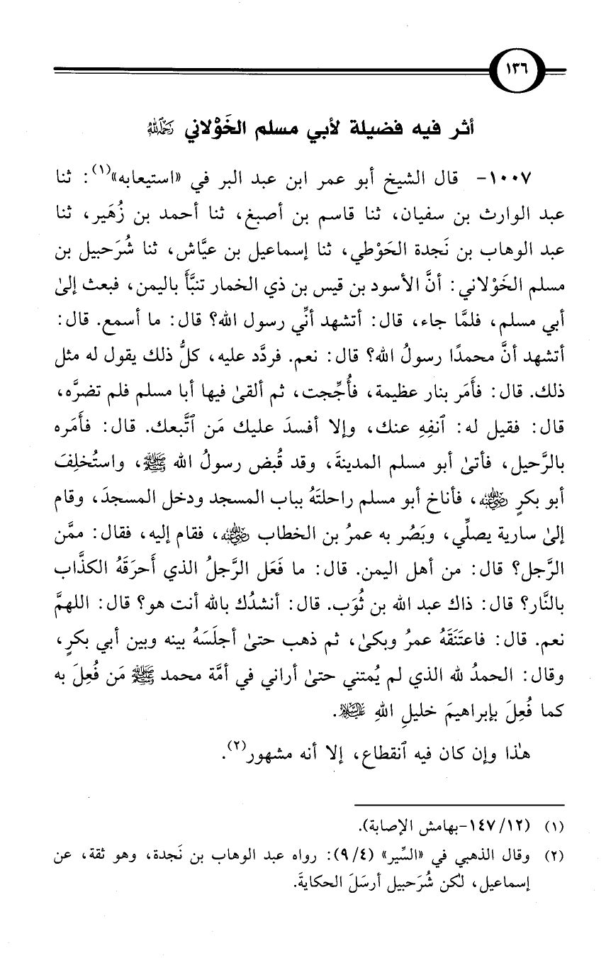 (1007) قال الشيخ أبو عمر ابن عبد البر في «استيعابه» (¬1): ثنا عبد الوارث بن سفيان، ثنا قاسم بن أصبغ، ثنا أحمد بن زُهَير، ثنا عبد الوهاب بن نَجدة الحَوْطي، ثنا إسماعيل بن عيَّاش، ثنا شُرَحبيل بن مسلم الخَوْلاني: أنَّ الأسود بن قيس بن ذي الخمار تنبَّأَ باليمن، فبعث إلى أبي مسلم، فلمَّا جاء، قال: أتشهد أنِّي رسول الله؟ قال: ما أسمع. قال: أتشهد أنَّ محمدًا رسولُ الله؟ قال: نعم. فردَّد عليه، كلُّ ذلك يقول له مثل ذلك. قال: فأَمَر بنار عظيمة، فأُجِّجت، ثم ألقى فيها أبا مسلم فلم تضرَّه، قال: فقيل له: انفِهِ عنك، وإلا أفسدَ عليك مَن اتَّبعك. قال: فأَمَره بالرَّحيل، فأتى أبو مسلم المدينةَ، وقد قُبض رسولُ الله صلى الله عليه وسلم، واستُخلِفَ أبو بكرٍ -رضي الله عنه-، فأناخ أبو مسلم راحلتَهُ بباب المسجد ودخل المسجدَ، وقام إلى سارية يصلِّي، وبَصُر به عمرُ بن الخطاب -رضي الله عنه-، فقام إليه، فقال: ممَّن الرَّجل؟ قال: من أهل اليمن. قال: ما فَعَل الرَّجلُ الذي أَحرَقَهُ الكذَّاب بالنَّار؟ قال: ذاك عبد الله بن ثُوَب. قال: أنشدُك بالله أنت هو؟ قال: اللهمَّ نعم. قال: فاعتَنَقَهُ عمرُ وبكى، ثم ذهب حتى أجلَسَهُ بينه وبين أبي بكرٍ، وقال: الحمدُ لله الذي لم يُمتني حتى أراني في أمَّة محمد صلى الله عليه وسلم مَن فُعِلَ به كما فُعِلَ بإبراهيمَ خليلِ اللهِ عليه السلام.