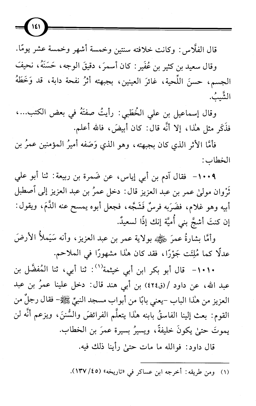 (1010) قال أبو بكر ابن أبي خيثمة (¬1): ثنا أبي، ثنا المُفضَّل بن عبد الله، عن داود / (ق 424) بن أبي هند قال: دخل علينا عمرُ بن عبد العزيز من هذا الباب -يعني بابًا من أبواب مسجد النبيِّ صلى الله عليه وسلم- فقال رجلٌ من القوم: بعث إلينا الفاسقُ بابنه هذا يتعلَّم الفرائضَ والسُّننَ، ويزعم أنَّه لن يموتَ حتى يكونَ خليفةً، ويسيرُ بسيرة عمرَ بن الخطاب.