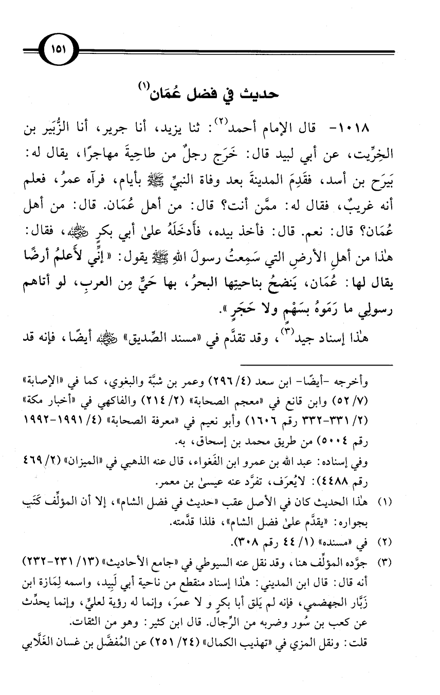 (1018) قال الإمام أحمد (¬2): ثنا يزيد، أنا جرير، أنا الزُّبَير بن الخِرِّيت، عن أبي لبيد قال: خَرَج رجلٌ من طاحِيةَ مهاجرًا، يقال له: بَيرَح بن أسد، فقَدِمَ المدينةَ بعد وفاة النبيِّ صلى الله عليه وسلم بأيام، فرآه عمرُ، فعلم أنه غريبٌ، فقال له: ممَّن أنت؟ قال: من أهل عُمَان. قال: من أهل عُمَان؟ قال: نعم. قال: فأخذ بيده، فأَدخَلَهُ على أبي بكرٍ -رضي الله عنه-، فقال: هذا من أهلِ الأرضِ التي سَمِعتُ رسولَ اللهِ صلى الله عليه وسلم يقول: «إنِّي لأَعلمُ أرضًا يقال لها: عُمَان، يَنضحُ بناحيتِها البحرُ، بها حَيٌّ مِن العربِ، لو أتاهم رسولِي ما رَمَوهُ بسَهْمٍ ولا حَجَرٍ».