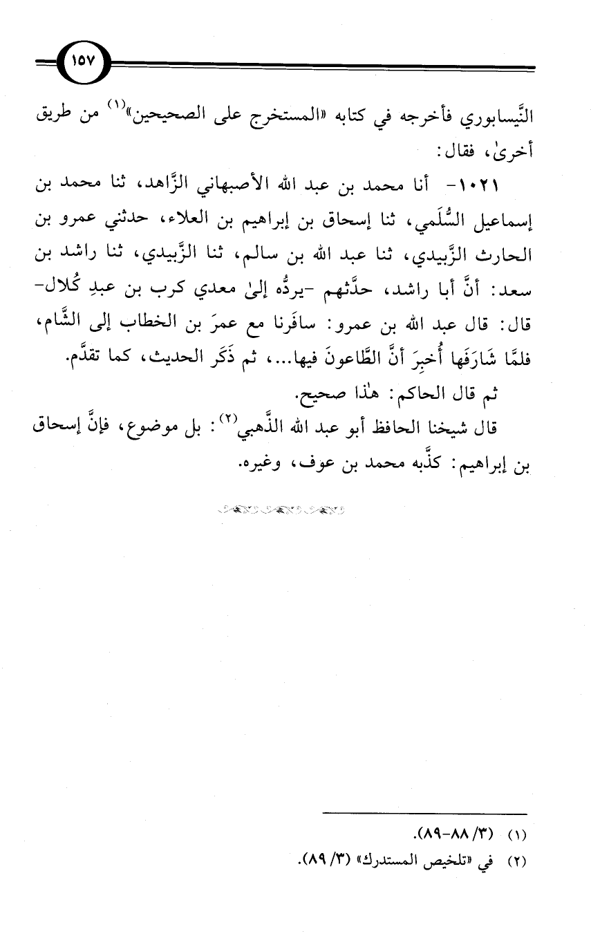 (1021) أنا محمد بن عبد الله الأصبهاني الزَّاهد، ثنا محمد بن إسماعيل السُّلَمي، ثنا إسحاق بن إبراهيم بن العلاء، حدثني عمرو بن الحارث الزَّبيدي، ثنا عبد الله بن سالم، ثنا الزَّبيدي، ثنا راشد بن سعد: أنَّ أبا راشد، حدَّثهم -يردُّه إلى معدي كرب بن عبدِ كُلال- قال: قال عبد الله بن عمرو: سافَرنا مع عمرَ بن الخطاب إلى الشَّام، فلمَّا شَارَفَها أُخبِرَ أنَّ الطَّاعونَ فيها ... ، ثم ذَكَر الحديث، كما تقدَّم.