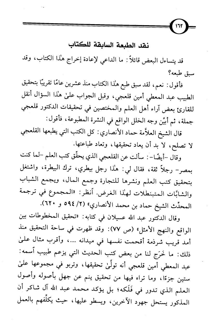 قال الشيخ العلاَّمة حماد الأنصاري: كل الكتب التي يطبعها القلعجي لاتصلح، لابد أن يعاد تحقيقها، وتعاد طباعتها.