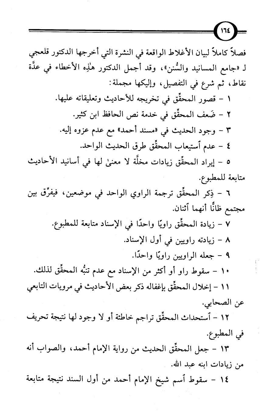 فصلاً كاملاً لبيان الأغلاط الواقعة في النشرة التي أخرجها الدكتور قلعجي لـ «جامع المسانيد والسُّنن»، وقد أجمل الدكتور هذه الأخطاء في عدَّة نقاط، ثم شرع في التفصيل، وإليكها مجملة: