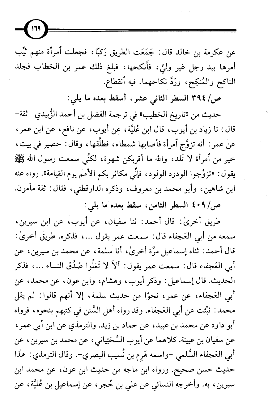 حديث من «تاريخ الخطيب» في ترجمة الفضل بن أحمد الزُّبيدي - ثقة - قال: نا زياد بن أيوب، قال ابن عُليَّة، عن أيوب، عن نافع، عن ابن عمر، عن عمر: أنه تزوَّج امرأة فأصابها شمطاء، فطلَّقها، وقال: حصير في بيت، خير من امرأة لا تَلد، والله ما أقربكن شهوة، لكنِّي سمعت رسول الله صلى الله عليه وسلم يقول: «تزوَّجوا الودود الولود، فإنِّي مكاثر بكم الأمم يوم القيامة». رواه عنه ابن شاهين، وأبو محمد بن معروف، وذكره الدارقطني، فقال: ثقة مأمون.