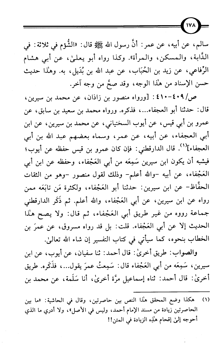 والصواب: طريق أخرى: قال أحمد: ثنا سفيان، عن أيوب، عن ابن سيرين، سَمِعَه من أبي العَجْفاء قال: سَمِعتُ عمرَ يقول ... ، فذَكَره. طريق أخرى: قال أحمد: ثناه إسماعيل مرَّة أخرى، أنا سَلَمة، عن محمد بن