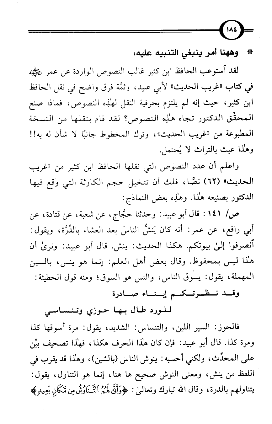 ص/ 141: قال أبو عبيد: وحدثنا حجَّاج، عن شعبة، عن قتادة، عن أبي رافع، عن عمر: أنه كان يَنشُّ الناسَ بعد العشاء بالدِّرَّة، ويقول: انصرفوا إلى بيوتكم. هكذا الحديث: ينش. قال أبو عبيد: ونرى أن هذا ليس بمحفوظ. وقال بعض أهل العلم: إنما هو ينس، بالسين المهملة، يقول: يسوق الناس، والنس هو السوق؛ ومنه قول الحطيئة: