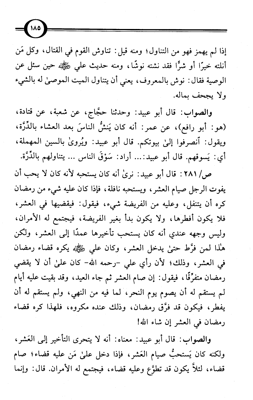 ص/281: قال أبو عبيد: نرى أنه كان يستحبه لأنه كان لا يحب أن يفوت الرجل صيام العشر، ويستحبه نافلة، فإذا كان عليه شيء من رمضان كره أن يتنفل، وعليه من الفريضة شيء، فيقول: فيقضيها في العشر، فلا يكون أفطرها، ولا يكون بدأ بغير الفريضة، فيجتمع له الأمران، وليس وجهه عندي أنه كان يستحب تأخيرها عمدًا إلى العشر، ولكن هذا لمن فرَّط حتى يدخل العشر، وكان علي -رضي الله عنه- يكره قضاء رمضان في العشر، وذلك؛ لأن رأي علي -رحمه الله- كان على أن لا يقضي رمضان متفرِّقًا، فيقول: إن صام العشر ثم جاء العيد، وقد بقيت عليه أيام لم يستقم له أن يصوم يوم النحر، لما فيه من النهي، ولم يستقم له أن يفطر، فيكون قد فرَّق رمضان، وذلك عنده مكروه، فلهذا كره قضاء رمضان في العشر إن شاء الله!