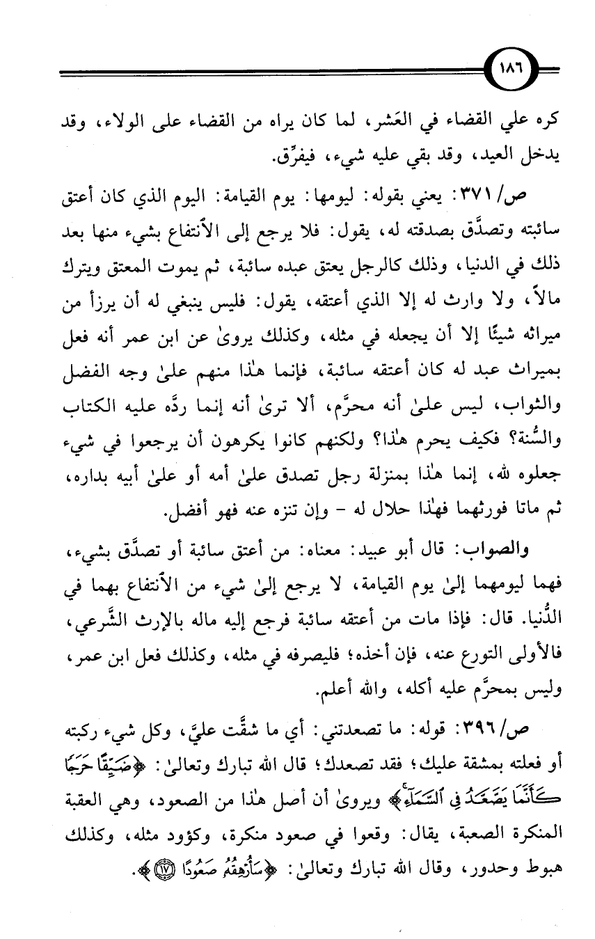 ص/371: يعني بقوله: ليومها: يوم القيامة: اليوم الذي كان أعتق سائبته وتصدَّق بصدقته له، يقول: فلا يرجع إلى الانتفاع بشيء منها بعد ذلك في الدنيا، وذلك كالرجل يعتق عبده سائبة، ثم يموت المعتق ويترك مالاً، ولا وارث له إلا الذي أعتقه، يقول: فليس ينبغي له أن يرزأ من ميراثه شيئًا إلا أن يجعله في مثله، وكذلك يروى عن ابن عمر أنه فعل بميراث عبد له كان أعتقه سائبة، فإنما هذا منهم على وجه الفضل والثواب، ليس على أنه محرَّم، ألا ترى أنه إنما ردَّه عليه الكتاب والسُّنة؟ فكيف يحرم هذا؟ ولكنهم كانوا يكرهون أن يرجعوا في شيء جعلوه لله، إنما هذا بمنزلة رجل تصدق على أمه أو على أبيه بداره، ثم ماتا فورثهما فهذا حلال له - وإن تنزه عنه فهو أفضل.