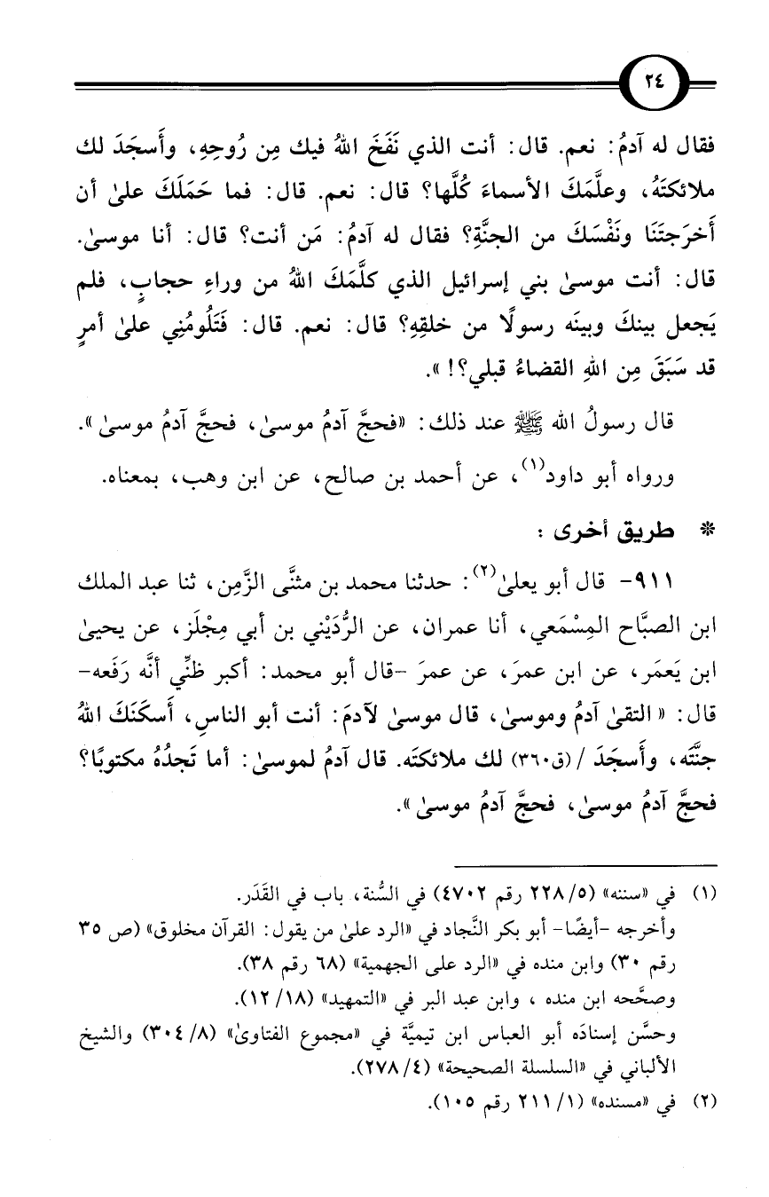 (911) قال أبو يعلى (¬2): حدثنا محمد بن مثنَّى الزَّمِن، ثنا عبد الملك بن الصبَّاح المِسْمَعي، أنا عمران، عن الرُّدَيْني بن أبي مِجْلَز، عن يحيى بن يَعمَر، عن ابن عمرَ، عن عمرَ -قال أبو محمد: أكبر ظنِّي أنَّه رَفَعه- قال: «التقى آدمُ وموسى، قال موسى لآدمَ: أنت أبو الناسِ، أَسكَنَكَ اللهُ جنَّتَه، وأَسجَدَ / (ق 360) لك ملائكتَه. قال آدمُ لموسى: أما تَجدُهُ مكتوبًا؟ فحجَّ آدمُ موسى، فحجَّ آدمُ موسى».