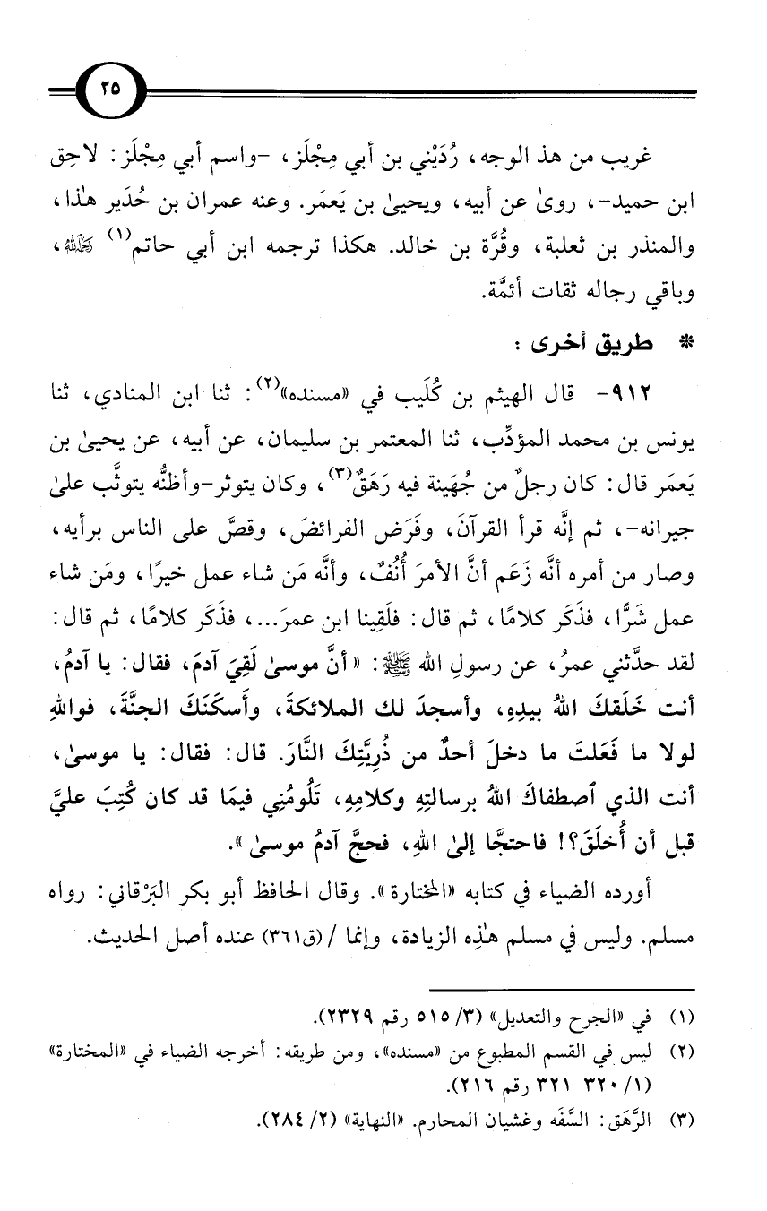 (912) قال الهيثم بن كُلَيب في «مسنده» (¬2): ثنا ابن المنادي، ثنا يونس بن محمد المؤدِّب، ثنا المعتمر بن سليمان، عن أبيه، عن يحيى بن يَعمَر قال: كان رجلٌ من جُهَينة فيه رَهَقٌ (¬3)، وكان يتوثر-وأظنُّه يتوثَّب على جيرانه-، ثم إنَّه قرأ القرآنَ، وفَرَض الفرائضَ، وقصَّ على الناس برأيه، وصار من أمره أنَّه زَعَم أنَّ الأمرَ أُنُفٌ، وأنَّه مَن شاء عمل خيرًا، ومَن شاء عمل شَرًّا، فذَكَر كلامًا، ثم قال: فلَقِينا ابنَ عمرَ ... ، فذَكَر كلامًا، ثم قال: لقد حدَّثني عمرُ، عن رسولِ الله صلى الله عليه وسلم: «أنَّ موسى لَقِيَ آدمَ، فقال: يا آدمُ، أنت خَلَقكَ اللهُ بيدِهِ، وأسجدَ لك الملائكةَ، وأَسكَنَكَ الجنَّةَ، فواللهِ لولا ما فَعَلتَ ما دخلَ أحدٌ من ذُرِيَّتِكَ النَّارَ. قال: فقال: يا موسى، أنت الذي اصطفاكَ اللهُ برسالتِهِ وكلامِهِ، تَلُومُنِي فيمَا قد كان كُتِبَ عليَّ قبل أن أُخلَقَ؟! فاحتجَّا إلى اللهِ، فحجَّ آدمُ موسى».