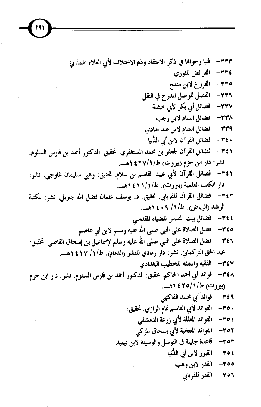 فضائل القرآن لجعفر بن محمد المستغفري. تحقيق: الدكتور أحمد بن فارس السلوم. نشر: دار ابن حزم (بيروت) ط/1/ 1427 هـ.