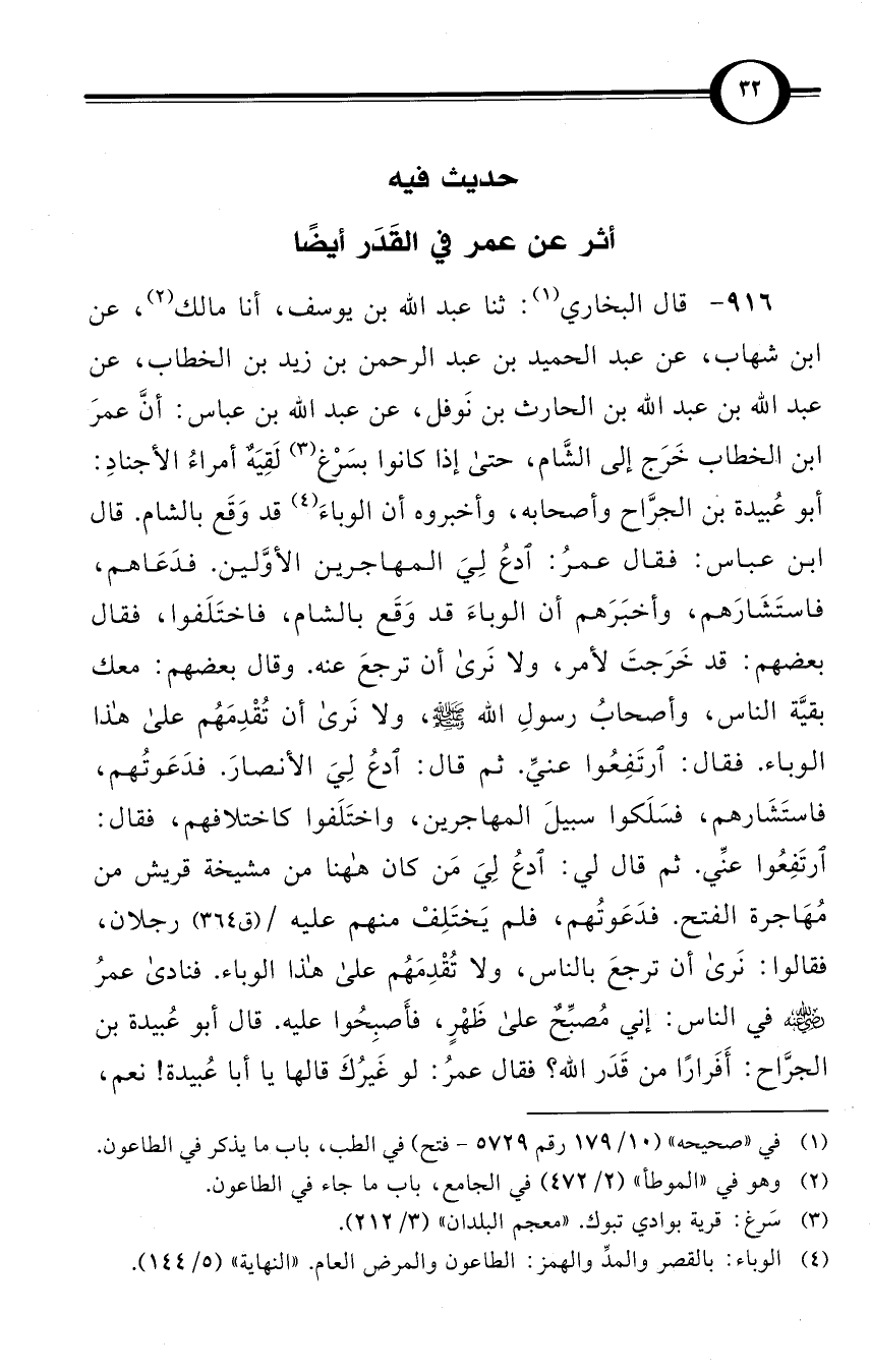 (916) قال البخاري (¬1): ثنا عبد الله بن يوسف، أنا مالك (¬2)، عن ابن شهاب، عن عبد الحميد بن عبد الرحمن بن زيد بن الخطاب، عن عبد الله بن عبد الله بن الحارث بن نَوفل، عن عبد الله بن عباس: أنَّ عمرَ بن الخطاب خَرَج إلى الشَّام، حتى إذا كانوا بسَرْغ (¬3) لَقِيَهٌ أمراءُ الأجنادِ: أبو عُبيدة بن الجرَّاح وأصحابه، وأخبروه أن الوباءَ (¬4) قد وَقَع بالشام. قال ابن عباس: فقال عمرُ: اُدعُ لِيَ المهاجرين الأوَّلين. فدَعَاهم، فاستَشَارَهم، وأخبَرَهم أن الوباءَ قد وَقَع بالشام، فاختَلَفوا، فقال بعضهم: قد خَرَجتَ لأمر، ولا نَرَى أن ترجعَ عنه. وقال بعضهم: معك بقيَّة الناس، وأصحابُ رسولِ الله صلى الله عليه وسلم، ولا نَرَى أن تُقْدِمَهُم على هذا الوباء. فقال: ارتَفِعُوا عنيِّ. ثم قال: ادعُ لِيَ الأنصارَ. فدَعَوتُهم، فاستَشَارهم، فسَلَكوا سبيلَ المهاجرين، واختَلَفوا كاختلافهم، فقال: ارتَفِعُوا عنِّي. ثم قال لي: ادعُ لِيَ مَن كان ههنا من مشيخة قريش من مُهَاجرة الفتح. فدَعَوتُهم، فلم يَختَلِفْ منهم عليه / (ق 364) رجلان، فقالوا: نَرَى أن ترجعَ بالناس، ولا تُقْدِمَهُم على هذا الوباء. فنادى عمرُ -رضي الله عنه- في الناس: إني مُصبِّحٌ على ظَهْرٍ، فأَصبِحُوا عليه.