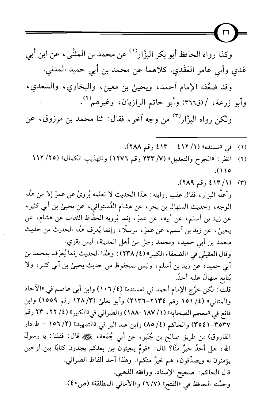 وأعلَّه البزار، فقال عقب روايته: هذا الحديث لا نعلمه يُروى عن عمرَ إلا من هذا الوجه، وحديث المنهال بن بحر، عن هشام الدَّستوائي، عن يحيى بن أبي كثير، عن زيد بن أسلم، عن أبيه، عن عمرَ، إنما يَرويه الحفَّاظ الثقات عن هشام، عن يحيى، عن زيد بن أسلم، عن عمرَ، مرسلاً، وإنما يُعرَف هذا الحديث من حديث محمد بن أبي حميد، ومحمد رجل من أهل المدينة، ليس بقوي.