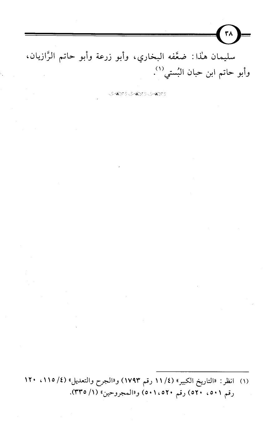 سليمان هذا: ضعَّفه البخاري، وأبو زرعة وأبو حاتم الرَّازيان، وأبو حاتم ابن حبان البُستي (¬1).