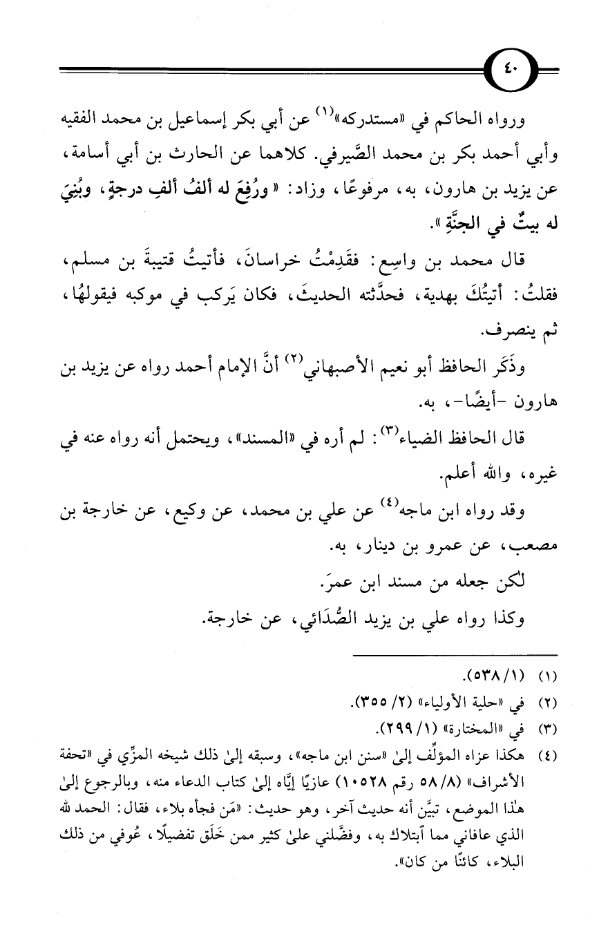 ورواه الحاكم في «مستدركه» (¬1) عن أبي بكر إسماعيل بن محمد الفقيه وأبي أحمد بكر بن محمد الصَّيرفي. كلاهما عن الحارث بن أبي أسامة، عن يزيد بن هارون، به، مرفوعًا، وزاد: «ورُفِعَ له ألفُ ألفِ درجةٍ، وبُنِيَ له بيتٌ في الجنَّةِ».