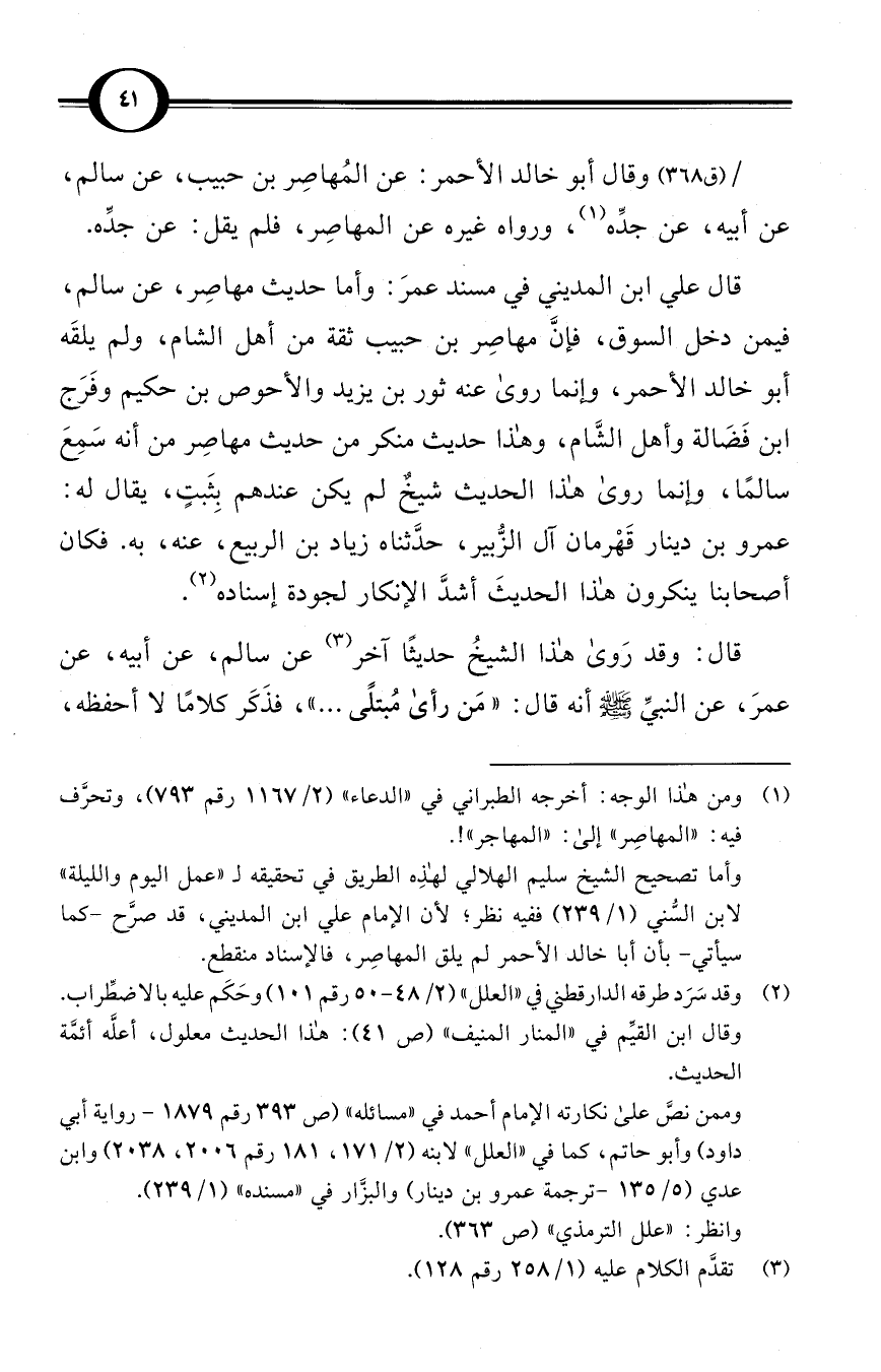 قال علي ابن المديني في مسند عمرَ: وأما حديث مهاصِر، عن سالم، فيمن دخل السوق، فإنَّ مهاصِر بن حبيب ثقة من أهل الشام، ولم يلقَه أبو خالد الأحمر، وإنما روى عنه ثور بن يزيد والأحوص بن حكيم وفَرَج بن فَضَالة وأهل الشَّام، وهذا حديث منكر من حديث مهاصِر من أنه سَمِعَ سالمًا، وإنما روى هذا الحديث شيخٌ لم يكن عندهم بِثَبتٍ، يقال له: عمرو بن دينار قَهْرمان آل الزُّبير، حدَّثناه زياد بن الربيع، عنه، به. فكان أصحابنا ينكرون هذا الحديثَ أشدَّ الإنكار لجودة إسناده (¬2).