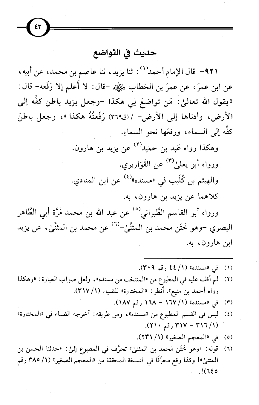 (921) قال الإمام أحمد (¬1): ثنا يزيد، ثنا عاصم بن محمد، عن أبيه، عن ابن عمرَ، عن عمرَ بن الخطاب رضي الله عنه -قال: لا أَعلم إلا رَفَعه- قال: «يقول الله تعالى: مَن تواضعَ لِي هكذا -وجعل يزيد باطن كفِّه إلى الأرض، وأدناها إلى الأرض- / (ق 369) رَفَعتُهُ هكذا»، وجعل باطنَ كفِّه إلى السماء، ورفعَها نحو السماءِ.