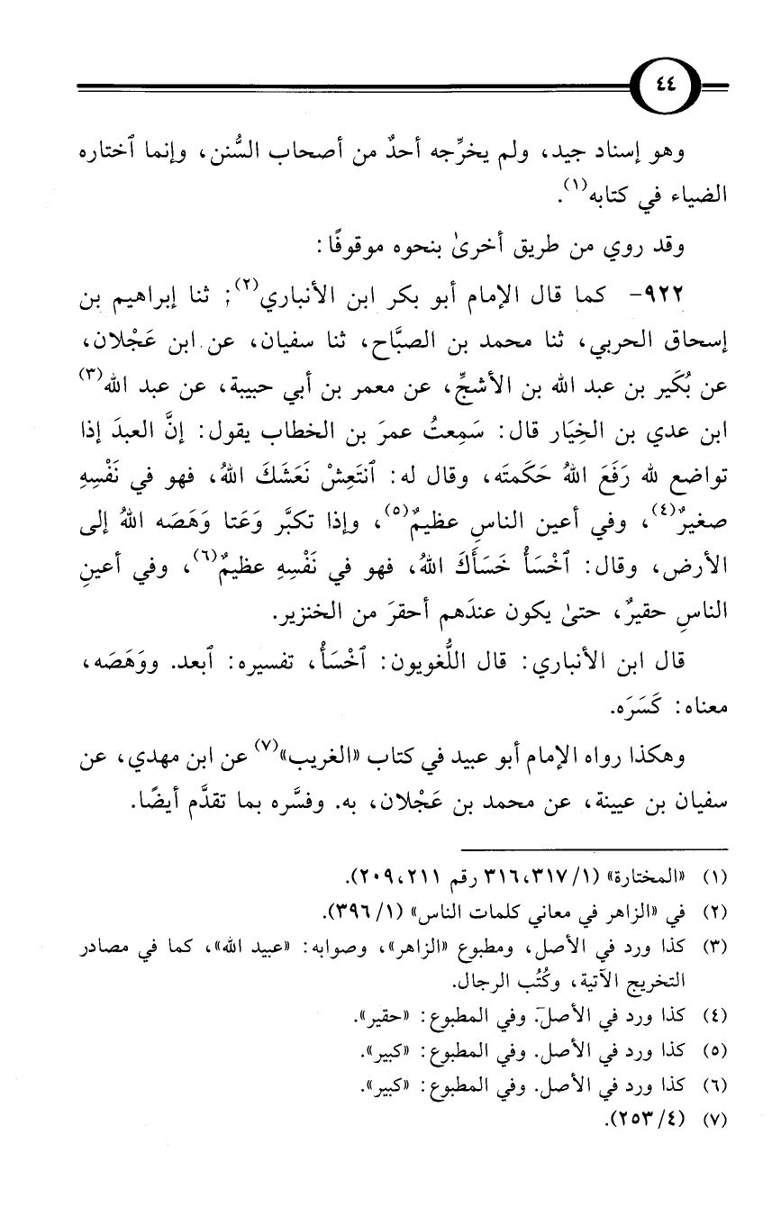 (922) كما قال الإمام أبو بكر ابن الأنباري (¬2): ثنا إبراهيم بن إسحاق الحربي، ثنا محمد بن الصبَّاح، ثنا سفيان، عن ابن عَجْلان، عن بُكَير بن عبد الله بن الأشجِّ، عن معمر بن أبي حبيبة، عن عبد الله (¬3) بن عدي بن الخِيَار قال: سَمِعتُ عمرَ بن الخطاب يقول: إنَّ العبدَ إذا تواضع لله رَفَعَ اللهُ حَكَمتَه، وقال له: انتَعِشْ نَعَشَكَ اللهُ، فهو في نَفْسِهِ صغيرٌ (¬4)، وفي أعين الناسِ عظيمٌ (¬5)، وإذا تكبَّر وَعَتا وَهَصَه اللهُ إلى الأرض، وقال: اِخْسَأْ خَسَأَكَ اللهُ، فهو في نَفْسِهِ عظيمٌ (¬6)، وفي أعينِ الناسِ حقيرٌ، حتى يكون عندَهم أحقرَ من الخنزير.