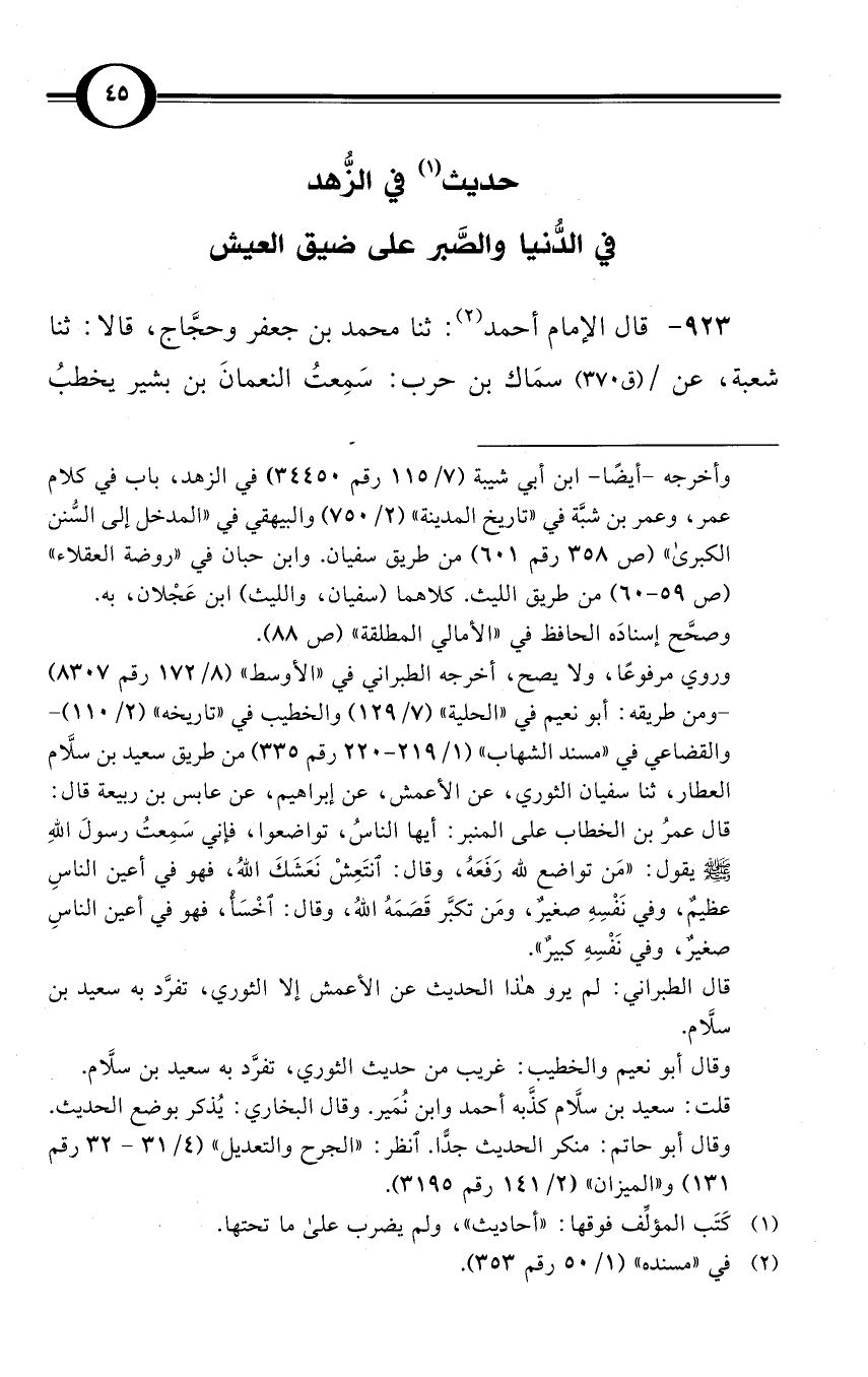 (923) قال الإمام أحمد (¬2): ثنا محمد بن جعفر وحجَّاج، قالا: ثنا شعبة، عن / (ق 370) سمَاك بن حرب: سَمِعتُ النعمانَ بن بشير يخطبُ