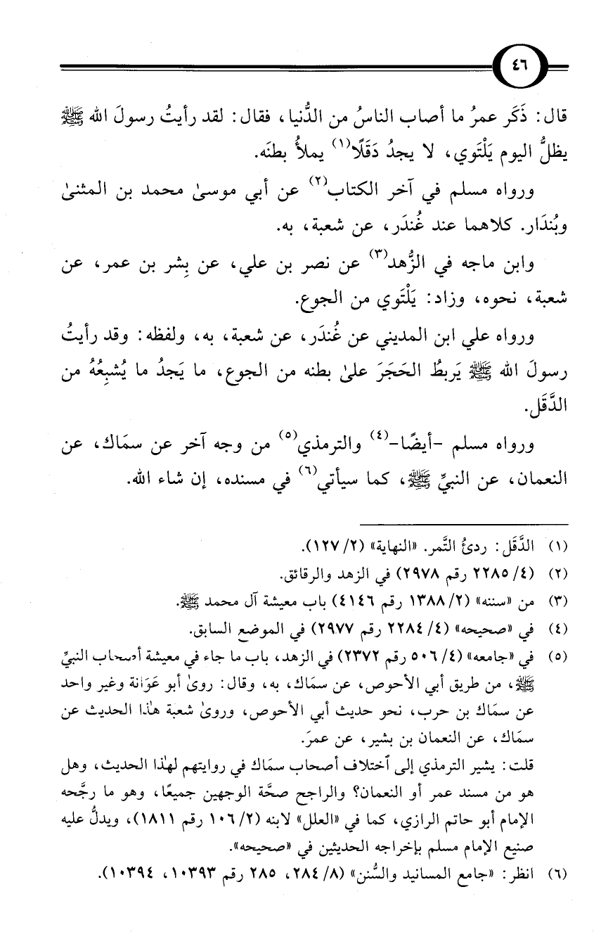 ورواه علي ابن المديني عن غُندَر، عن شعبة، به، ولفظه: وقد رأيتُ رسولَ الله صلى الله عليه وسلم يَربطُ الحَجَرَ على بطنه من الجوع، ما يَجدُ ما يُشبِعُهُ من الدَّقَل.