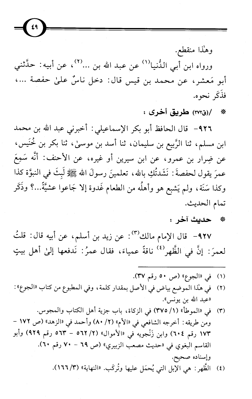 (926) قال الحافظ أبو بكر الإسماعيلي: أخبرني عبد الله بن محمد بن مسلم، ثنا الرَّبيع بن سليمان، ثنا أسد بن موسى، ثنا بكر بن خُنَيس، عن ضِرار بن عمرو، عن ابن سيرين أو غيره، عن الأحنف: أنَّه سَمِعَ عمرَ يقول لحفصةَ: نَشَدتُكِ بالله، تعلمينَ رسولَ الله صلى الله عليه وسلم لَبِثَ في النبوَّة كذا وكذا سَنَة، ولم يَشبع هو وأهلُه من الطعام غَدوة إلا جَاعوا عشيَّةً ... ؟ وذَكَر تمام الحديث.