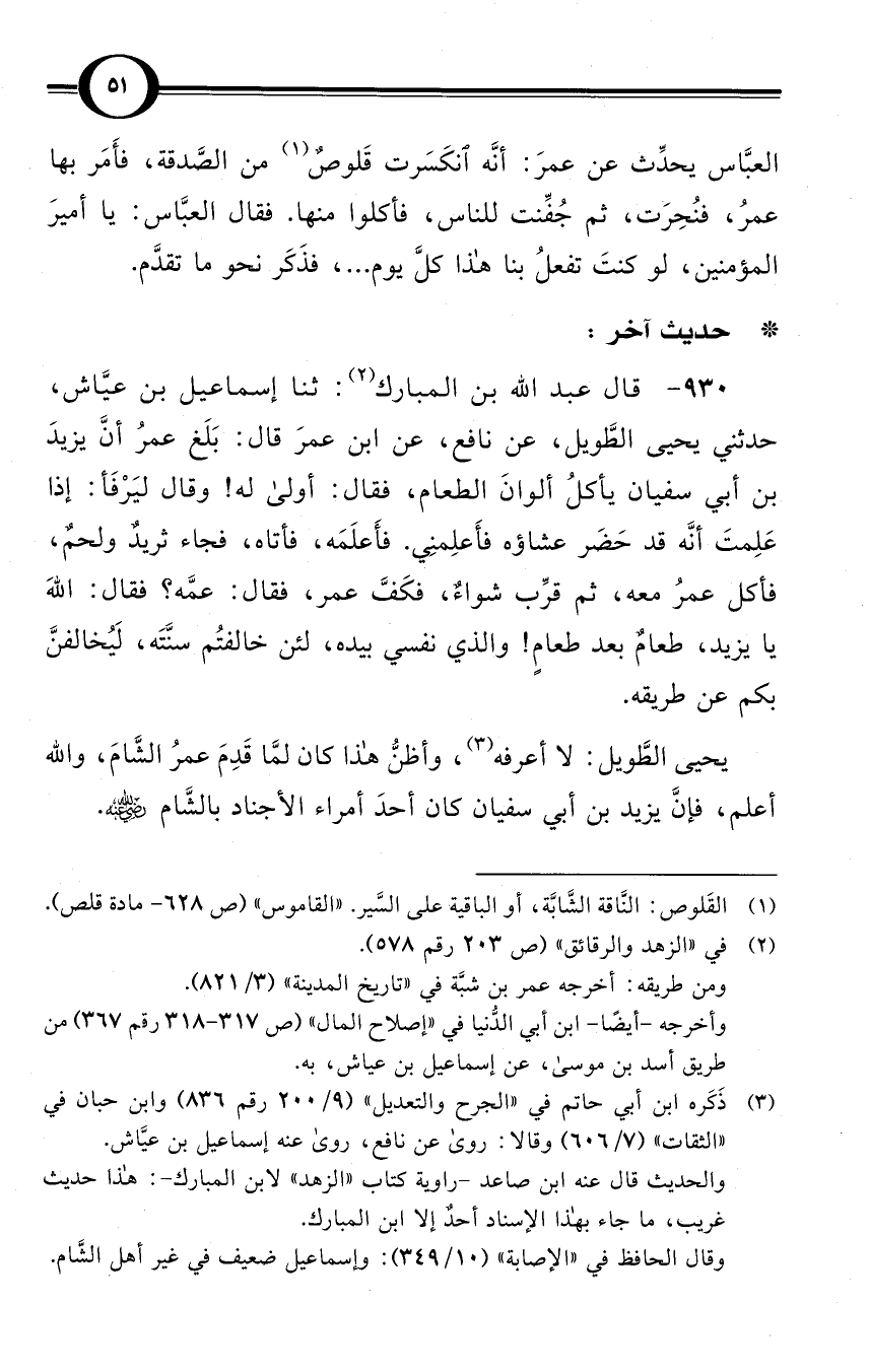 (930) قال عبد الله بن المبارك (¬2): ثنا إسماعيل بن عيَّاش، حدثني يحيى الطَّويل، عن نافع، عن ابن عمرَ قال: بَلَغ عمرُ أنَّ يزيدَ بن أبي سفيان يأكلُ ألوانَ الطعام، فقال: أولى له! وقال ليَرْفَأ: إذا عَلِمتَ أنَّه قد حَضَر عشاؤه فأَعلِمنِي. فأَعلَمَه، فأتاه، فجاء ثريدٌ ولحمٌ، فأكل عمرُ معه، ثم قرِّب شواءٌ، فكَفَّ عمر، فقال: عمَّه؟ فقال: اللهَ يا يزيد، طعامٌ بعد طعامٍ! والذي نفسي بيده، لئن خالفتُم سنَّتَه، لَيُخالفنَّ بكم عن طريقه.