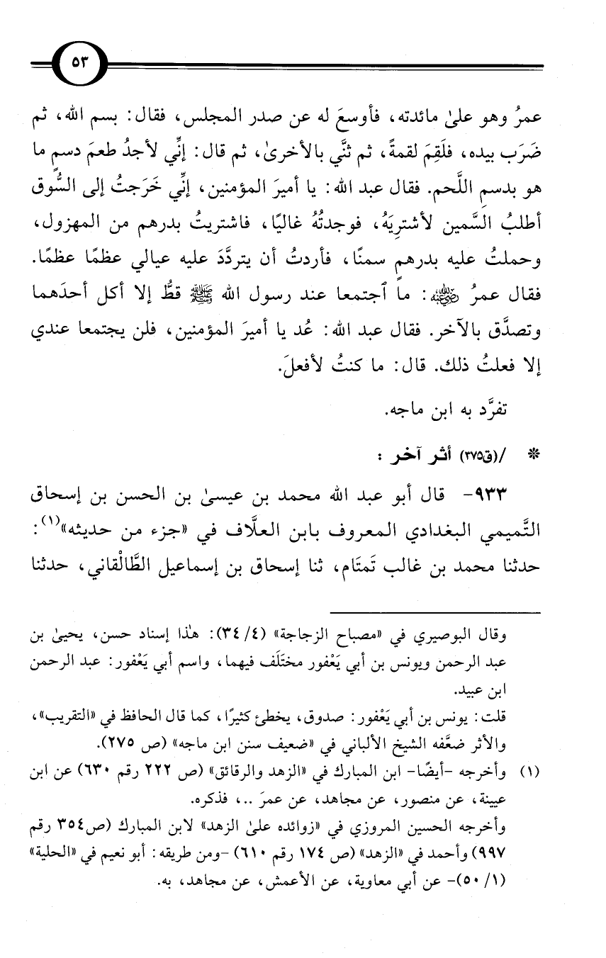 عمرُ وهو على مائدته، فأوسعَ له عن صدر المجلس، فقال: بسم الله، ثم ضَرَب بيده، فلَقِمَ لقمةً، ثم ثنَّي بالأخرى، ثم قال: إنِّي لأجدُ طعمَ دسمٍ ما هو بدسمِ اللَّحم. فقال عبد الله: يا أميرَ المؤمنين، إنِّي خَرَجتُ إلى السُّوق أطلبُ السَّمين لأشترِيَهُ، فوجدتُهُ غاليًا، فاشتريتُ بدرهم من المهزول، وحملتُ عليه بدرهمٍ سمنًا، فأردتُ أن يتردَّدَ عليه عيالي عظمًا عظمًا. فقال عمرُ رضي الله عنه: ما اجتمعا عند رسول الله صلى الله عليه وسلم قطُّ إلا أكل أحدَهما وتصدَّق بالآخر. فقال عبد الله: عُد يا أميرَ المؤمنين، فلن يجتمعا عندي إلا فعلتُ ذلك. قال: ما كنتُ لأفعلَ.