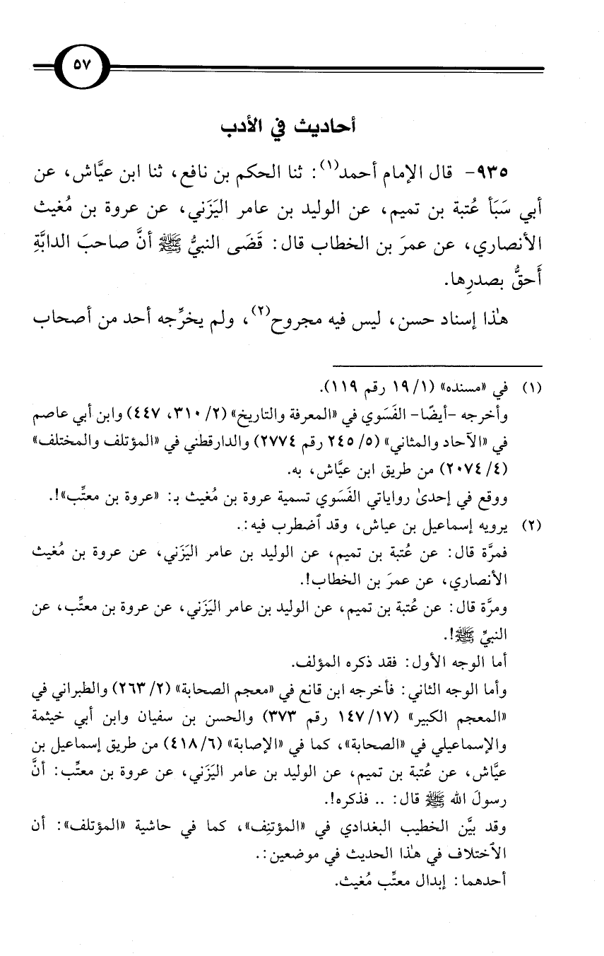(935) قال الإمام أحمد (¬1): ثنا الحكم بن نافع، ثنا ابن عيَّاش، عن أبي سَبَأ عُتبة بن تميم، عن الوليد بن عامر اليَزَني، عن عروة بن مُغيث الأنصاري، عن عمرَ بن الخطاب قال: قَضَى النبيُّ صلى الله عليه وسلم أنَّ صاحبَ الدابَّةِ أَحقُّ بصدرِها.