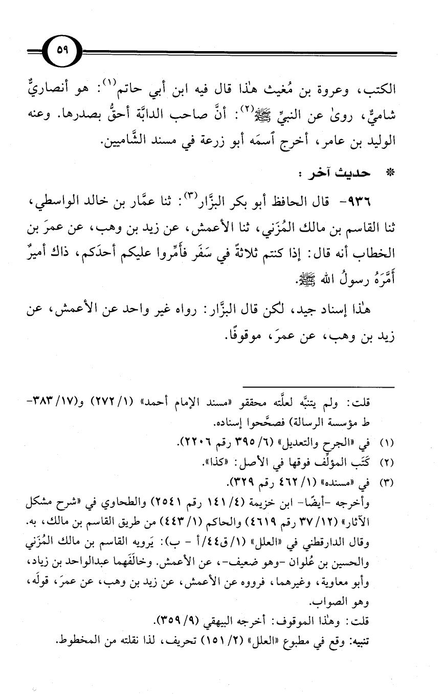 (936) قال الحافظ أبو بكر البزَّار (¬3): ثنا عمَّار بن خالد الواسطي، ثنا القاسم بن مالك المُزَني، ثنا الأعمش، عن زيد بن وهب، عن عمرَ بن الخطاب أنه قال: إذا كنتم ثلاثةً في سَفَر فأَمِّروا عليكم أحدَكم، ذاك أميرٌ أَمَّرَهُ رسولُ الله صلى الله عليه وسلم.