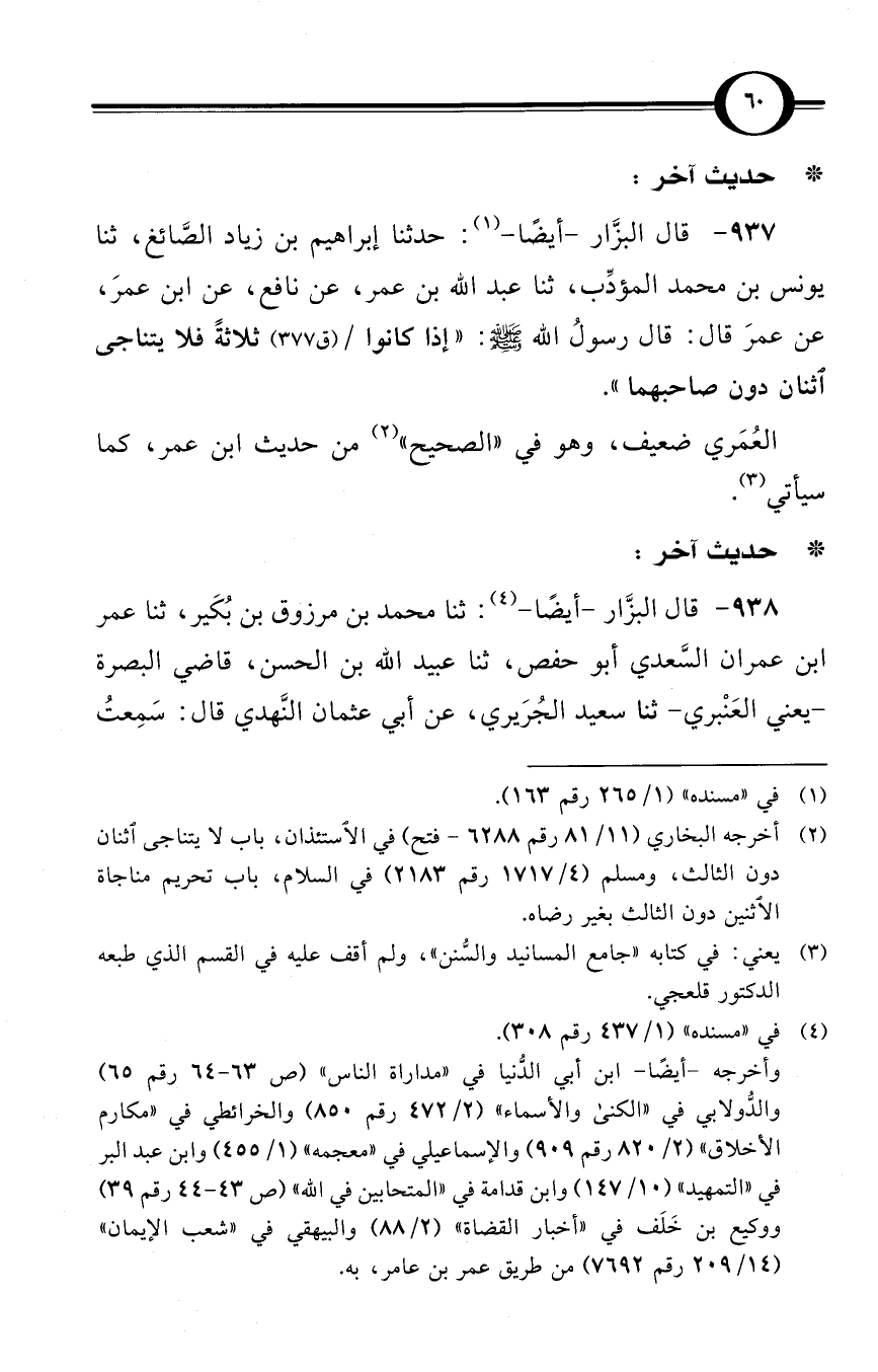 (937) قال البزَّار -أيضًا- (¬1): حدثنا إبراهيم بن زياد الصَّائغ، ثنا يونس بن محمد المؤدِّب، ثنا عبد الله بن عمر، عن نافع، عن ابن عمرَ، عن عمرَ قال: قال رسولُ الله صلى الله عليه وسلم: «إذا كانوا / (ق 377) ثلاثةً فلا يتناجى اثنان دون صاحبهما».