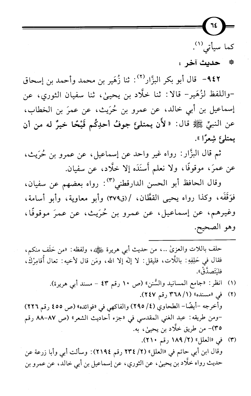 (942) قال أبو بكر البزَّار (¬2): ثنا زُهَير بن محمد وأحمد بن إسحاق -واللفظ لزُهَير- قالا: ثنا خلاَّد بن يحيى، ثنا سفيان الثوري، عن إسماعيل بن أبي خالد، عن عمرو بن حُرَيث، عن عمرَ بن الخطاب، عن النبيِّ صلى الله عليه وسلم قال: «لأَن يمتلئَ جوفُ أحدِكُم قَيْحًا خيرٌ له من أن يمتلئَ شِعرًا».