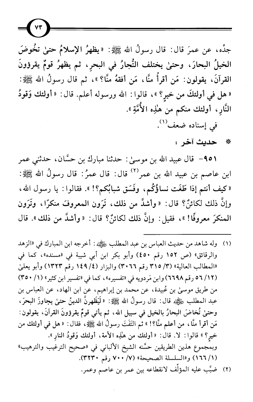 (951) قال عبيد الله بن موسى: حدثنا مبارك بن حسَّان، حدثني عمر بن عاصم بن عبيد الله بن عمر (¬2) قال: قال عمرُ: قال رسولُ الله صلى الله عليه وسلم: «كيف أنتم إذا طَغَت نساؤُكُم، وفَسَق شبابُكم؟!». فقالوا: يا رسول الله، وإنَّ ذلك لكائنٌ؟ قال: «وأشدَّ من ذلك، تَرَون المعروفَ منكرًا، وتَرَون المنكرَ معروفًا!»، فقيل: وإنَّ ذلك لكائنٌ؟ قال: «وأشدَّ من ذلك». قال
