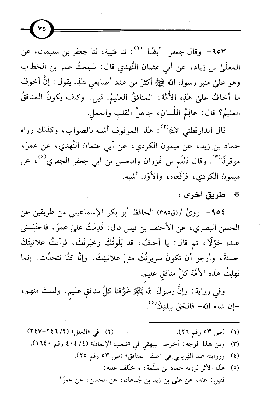 (954) روى / (ق 385) الحافظ أبو بكر الإسماعيلي من طريقين عن الحسن البصري، عن الأحنف بن قيس قال: قَدِمْتُ على عمرَ، فاحتَبَسني عنده حَوْلاً، ثم قال: يا أحنفُ، قد بَلَوتُكَ وخَبَرتُكَ، فرأيتُ علانيتَكَ حسنةً، وأرجو أن تكونَ سريرتُكَ مثلَ علانيتِكَ، وإنَّا كنَّا نتحدَّث: إنما يُهلِكُ هذه الأمَّة كلَّ منافقٍ عليمٍ.