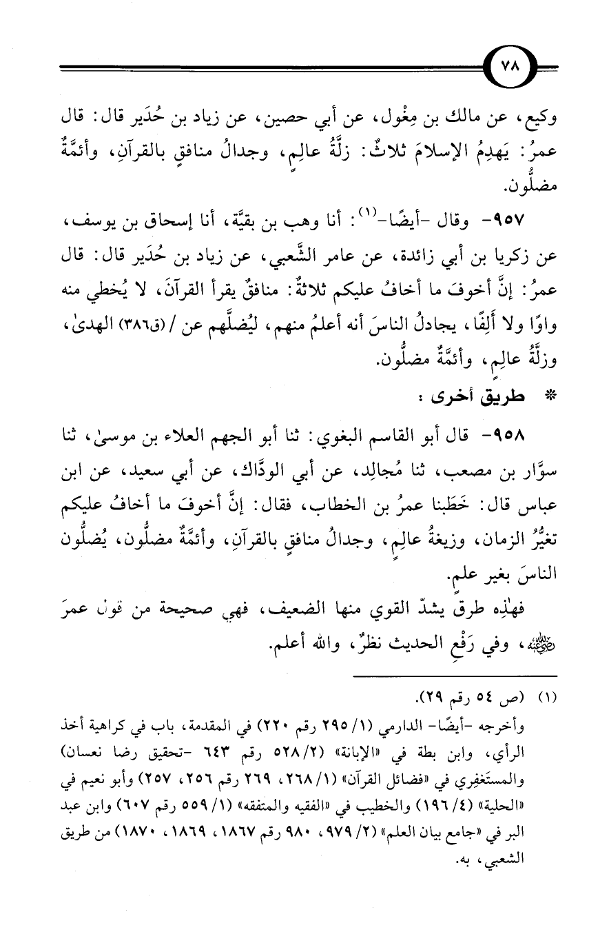 وكيع، عن مالك بن مِغْول، عن أبي حصين، عن زياد بن حُدَير قال: قال عمرُ: يَهدِمُ الإسلامَ ثلاثٌ: زلَّةُ عالِمٍ، وجدالُ منافقٍ بالقرآنِ، وأئمَّةٌ مضلُّون.