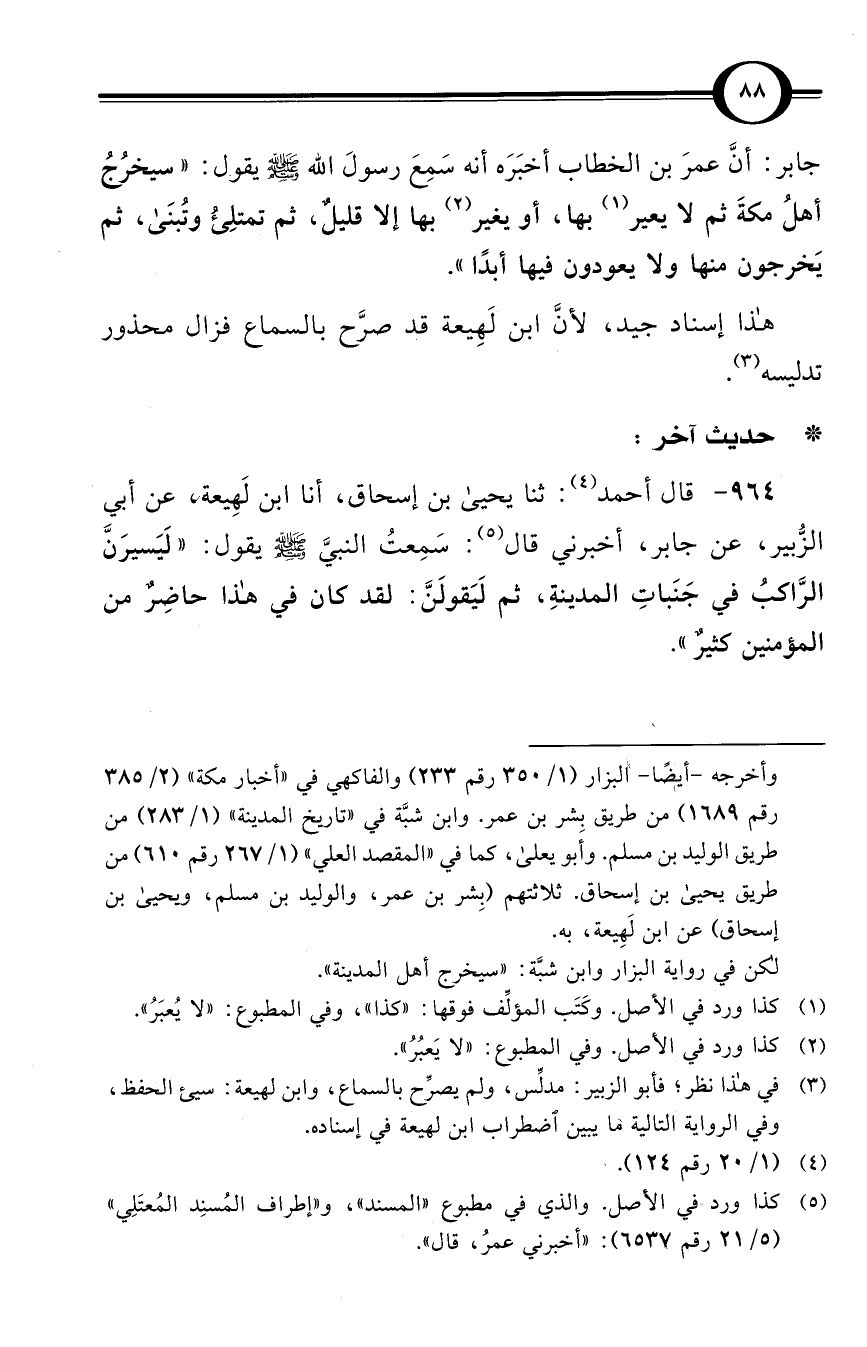 (964) قال أحمد (¬4): ثنا يحيى بن إسحاق، أنا ابن لَهِيعة، عن أبي الزُّبير، عن جابر، أخبرني قال (¬5): سَمِعتُ النبيَّ صلى الله عليه وسلم يقول: «لَيَسيرَنَّ الرَّاكبُ في جَنَباتِ المدينةِ، ثم لَيَقولَنَّ: لقد كان في هذا حاضِرٌ من المؤمنين كثيرٌ».